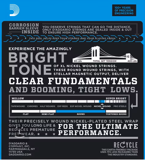 Struny pre elektrické basgitary značky D’Addario zo série XL Nickel Wound sú obľúbené vďaka svojmu vyváženému tónu a zvukovej univerzálnosti, vďaka čomu ich môžete využiť v akomkoľvek hudobnom štýle. Práve preto ide v rámci portfólia značky D’Addario o absolútny bestseller. Struny sú vyrobené zo šesťhranného oceľového jadra s vysokým obsahom uhlíka a sú obalené poniklovanou oceľou. Ich výroba prebieha v Spojených štátoch amerických.