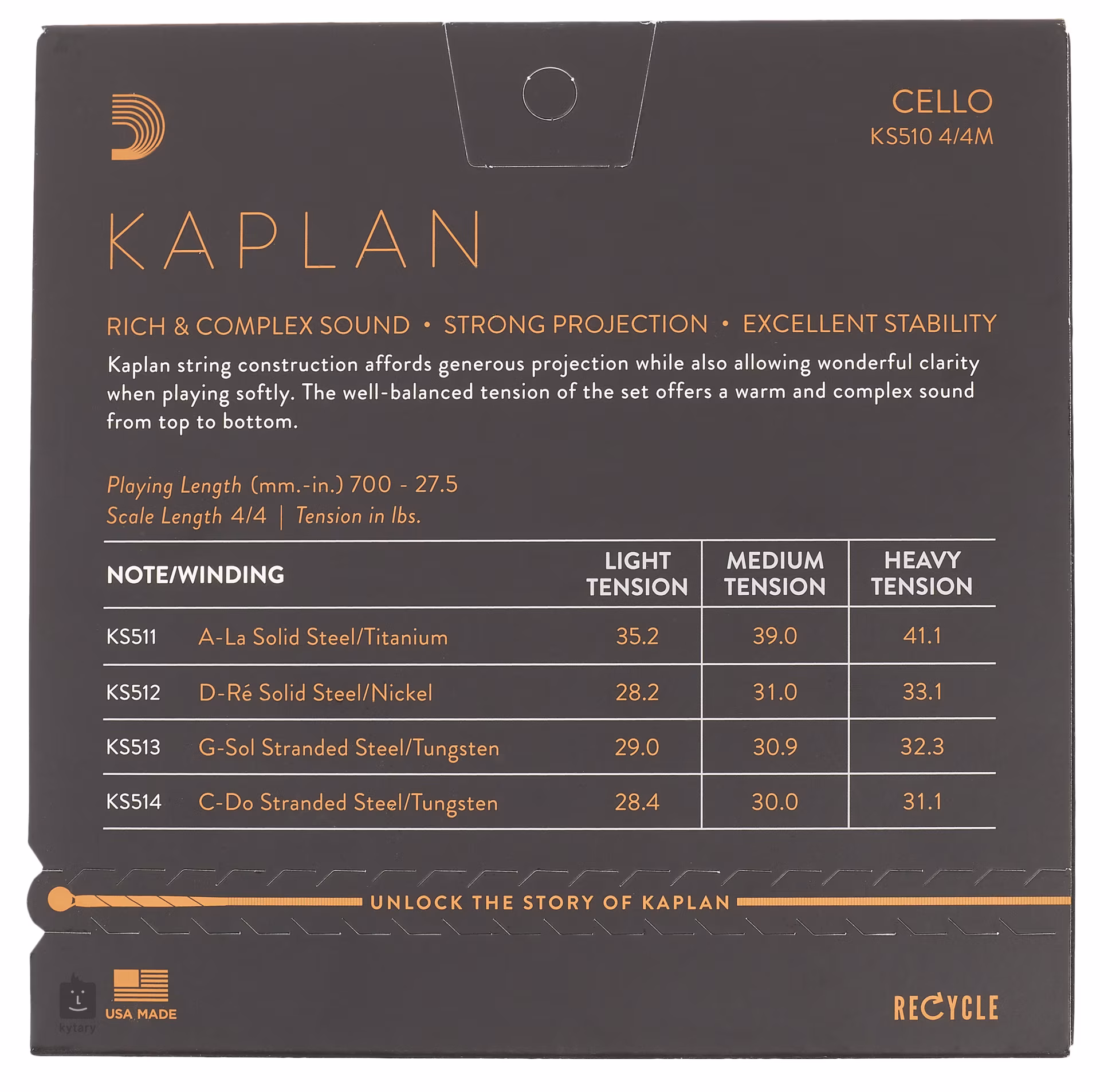 Profesionálne struny Kaplan, zložené z viacerých oceľových vlákien, výborne reagujú na hru slákom. Ich štruktúra ponúka veľmi pestrý tónový rozsah a bez problémov odoláva extrémnemu hraniu. Silný a špecificky teplý zvuk ocenia aj tí najnáročnejší hráči.