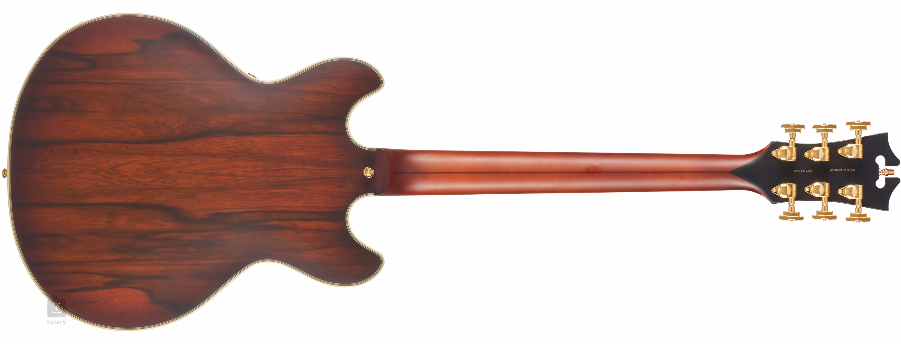 D'Angelico Deluxe Mini DC Satin Brown Burst je polodutá gitara s dvojitým výrezom a zmenšeným telom (šírka 14 palcov - 355 mm). Určite poteší hudobníkov, ktorým sa tradičné lubovky/semi-hollowbody zdajú príliš mohutné. Samotné telo gitary je vyrobené z laminovaného dreva dao/paldao s výraznou kresbou dreva. Odľahčený stredový blok spevňuje rezonančnú dosku a pôsobí proti nežiaducemu "viaznucemu" efektu lubového tela.