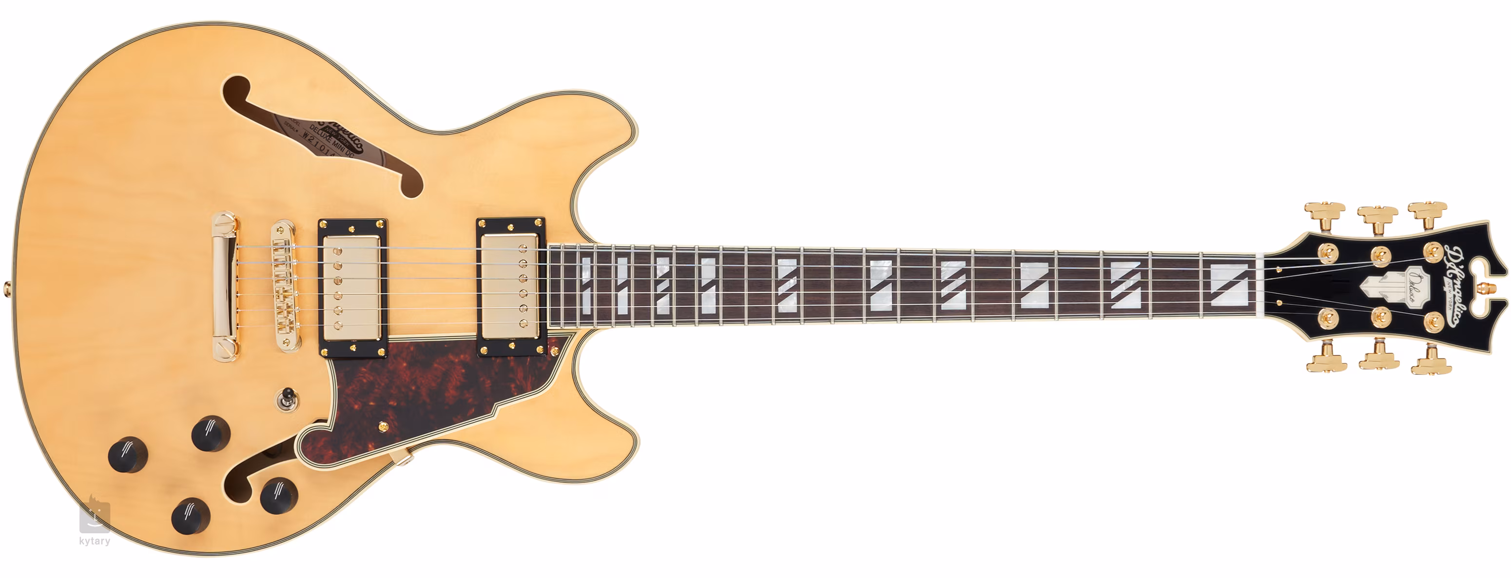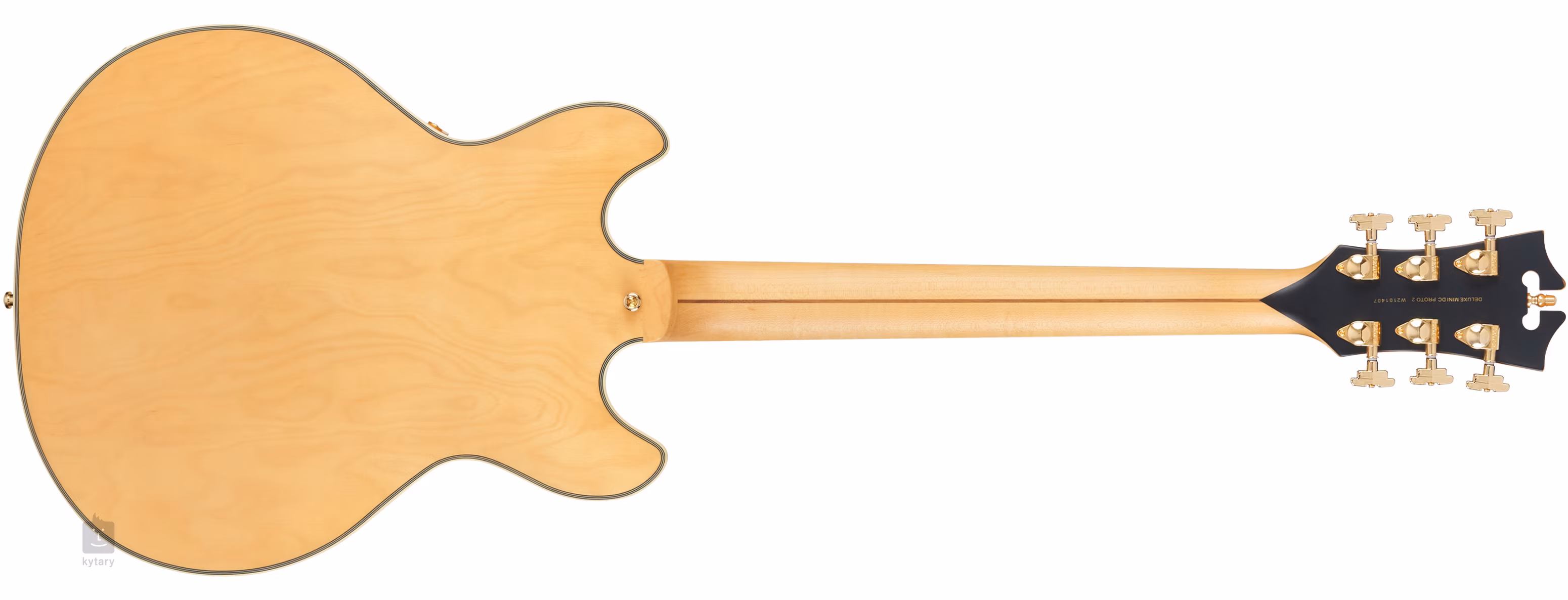 D'Angelico Deluxe Mini DC Satin Honey je polodutá gitara s dvojitým výrezom a zmenšeným telom (šírka 14 palcov - 355 mm). Určite poteší hudobníkov, ktorým sa tradičné lubovky/semi-hollowbody zdajú príliš mohutné. Samotné telo gitary je vyrobené z laminovaného javora. Odľahčený stredový blok spevňuje rezonančnú dosku a pôsobí proti nežiaducemu "viazaciemu" efektu mechov.