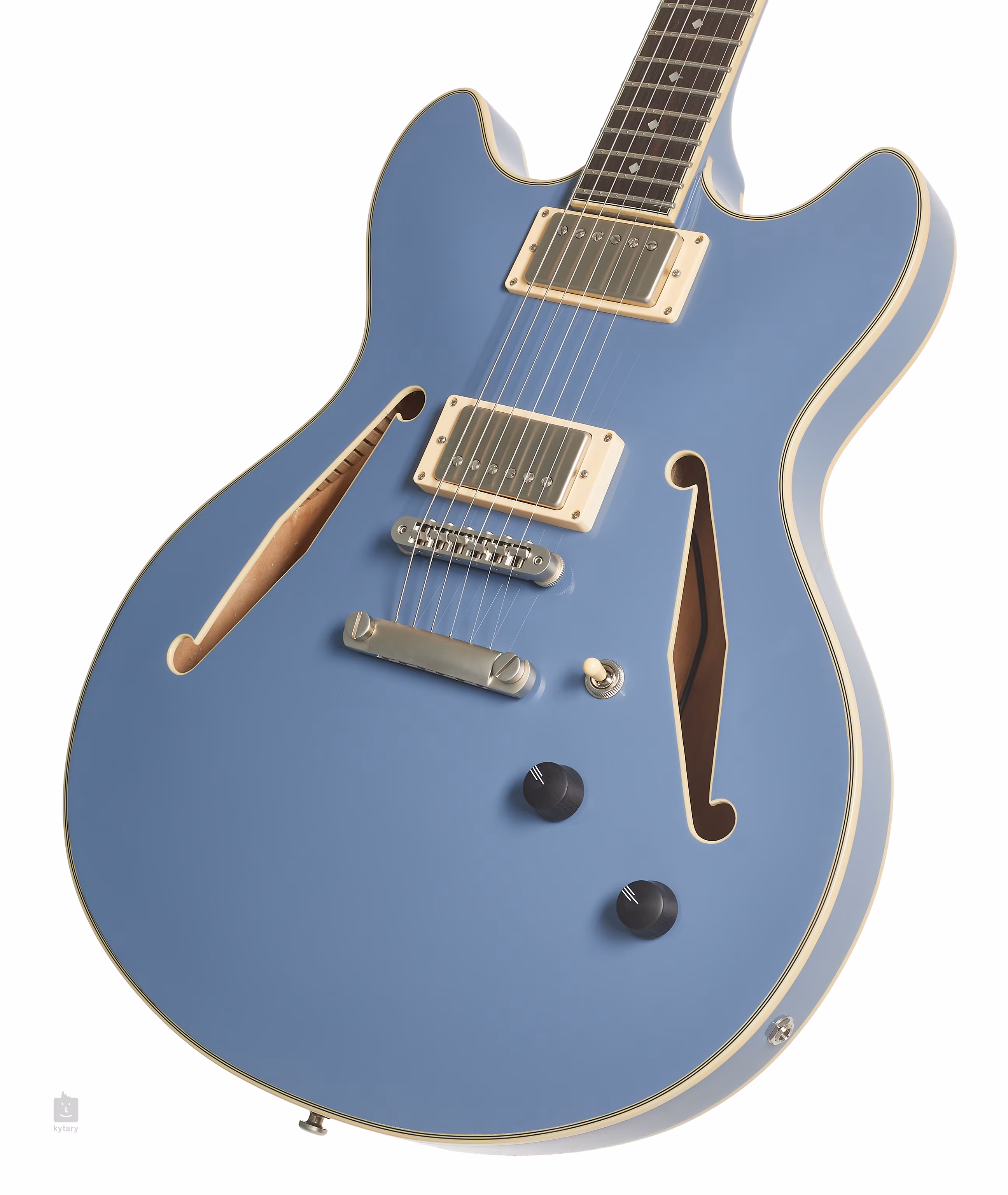 Double Cutaway w/ stop-bar tailpiece blue je polodutá gitara s dvoma výrezmi a šestnásť palcov širokým telom vyrobeným z laminovaného javora a masívneho stredového bloku. K javorovému krku je prilepený ebenový hmatník osadený dvadsiatimi dvoma Medium Jumbo pražcami. Úzky C profil krku zabezpečuje plynulý pohyb prstov po hmatníku a pohodlné držanie prstov, zatiaľ čo polohové značky z imitácie perlete uľahčujú orientáciu na povrchu hmatníka.