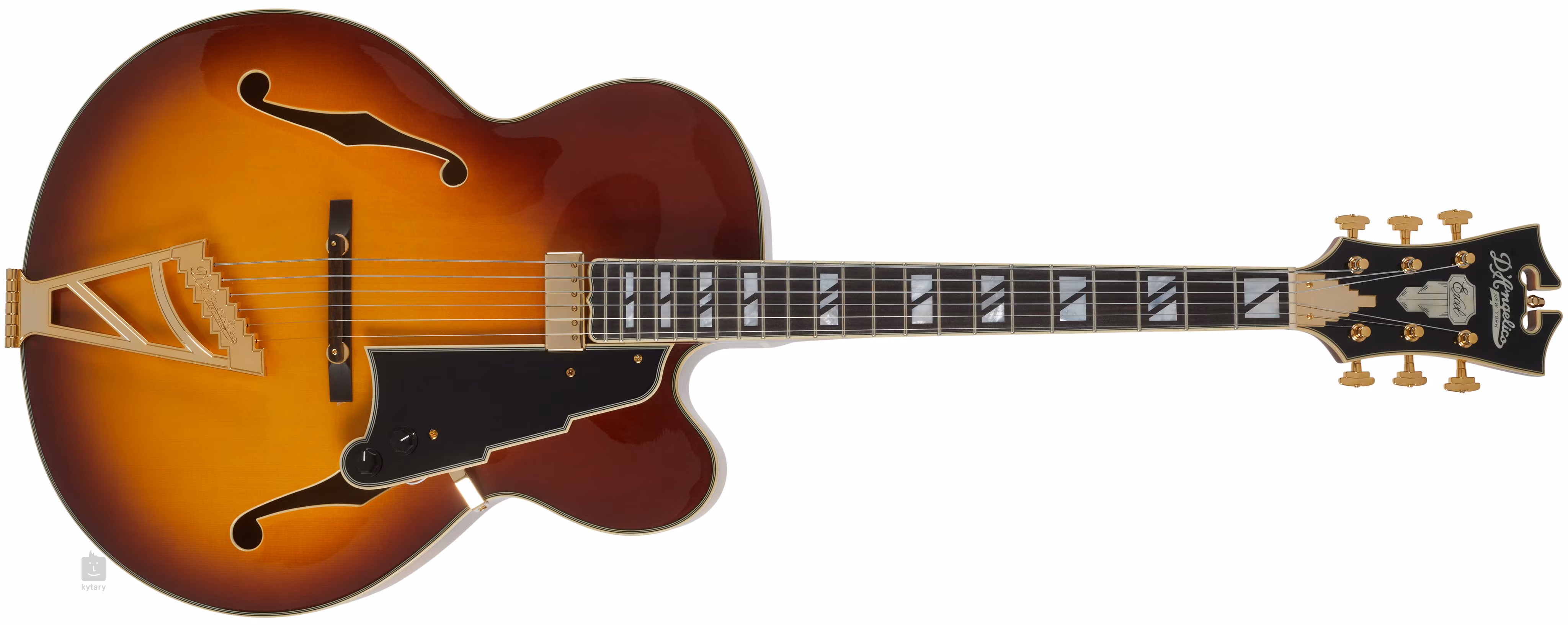 D'Angelico Excel Exl1 Dark Iced Tea Burst je gitara s dutým telom inšpirovaná dizajnom single-cut „Excel“ z roku 1947. Telo, vyrobené z laminovanej smrekovcovej prednej a zadnej dosky a laminovaných bokov z plamenného javora, ponúka teplý, prirodzený akustický zvuk vhodný pre rytmické aj sólové hranie. Trojdielny javorový a orechový krk s profilom „C“ je vybavený ebenovým hmatníkom s dvadsiatimi dvoma pražcami (Jescar 47/104 Nickel Silver). Pozícia značiek z perlete uľahčuje orientáciu na hmatníku.