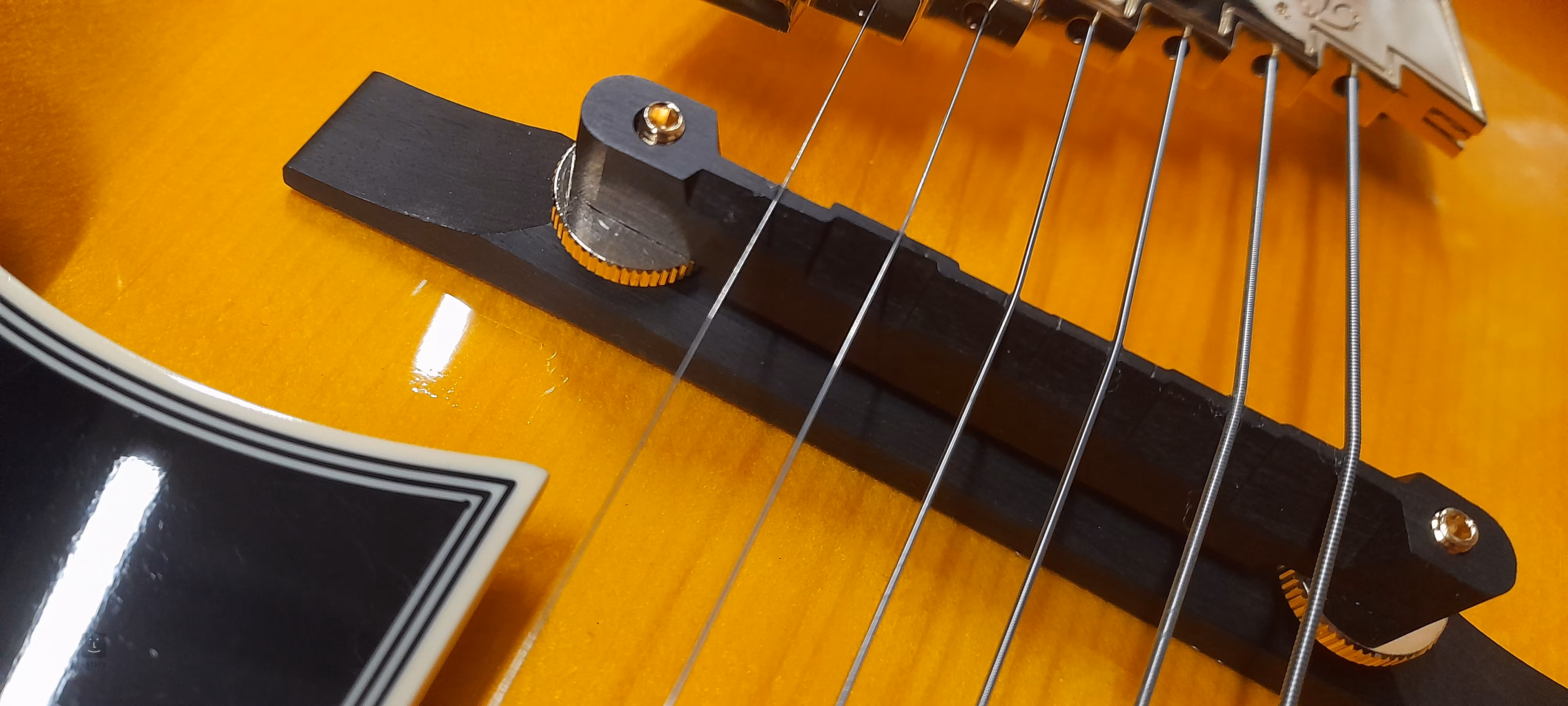 Stabilné ladenie a dobrý sustain zaručuje uchytenie strún prostredníctvom nultého pražca Graphtech NuBone XL v mechanikách Grover 150 Imperial s prevodovým pomerom 16:1 a ebenovým hmatníkom v kobylke D'Angelico Stairstep. Štýlový vzhľad gitary podčiarkuje lemovanie tela, hmatníka a hlavice, zlatý hardware, hlavička zdobená perleťovými firemnými a B style logami (Mother-of-Pearl) a päťvrstvová kobylka Scalini.
