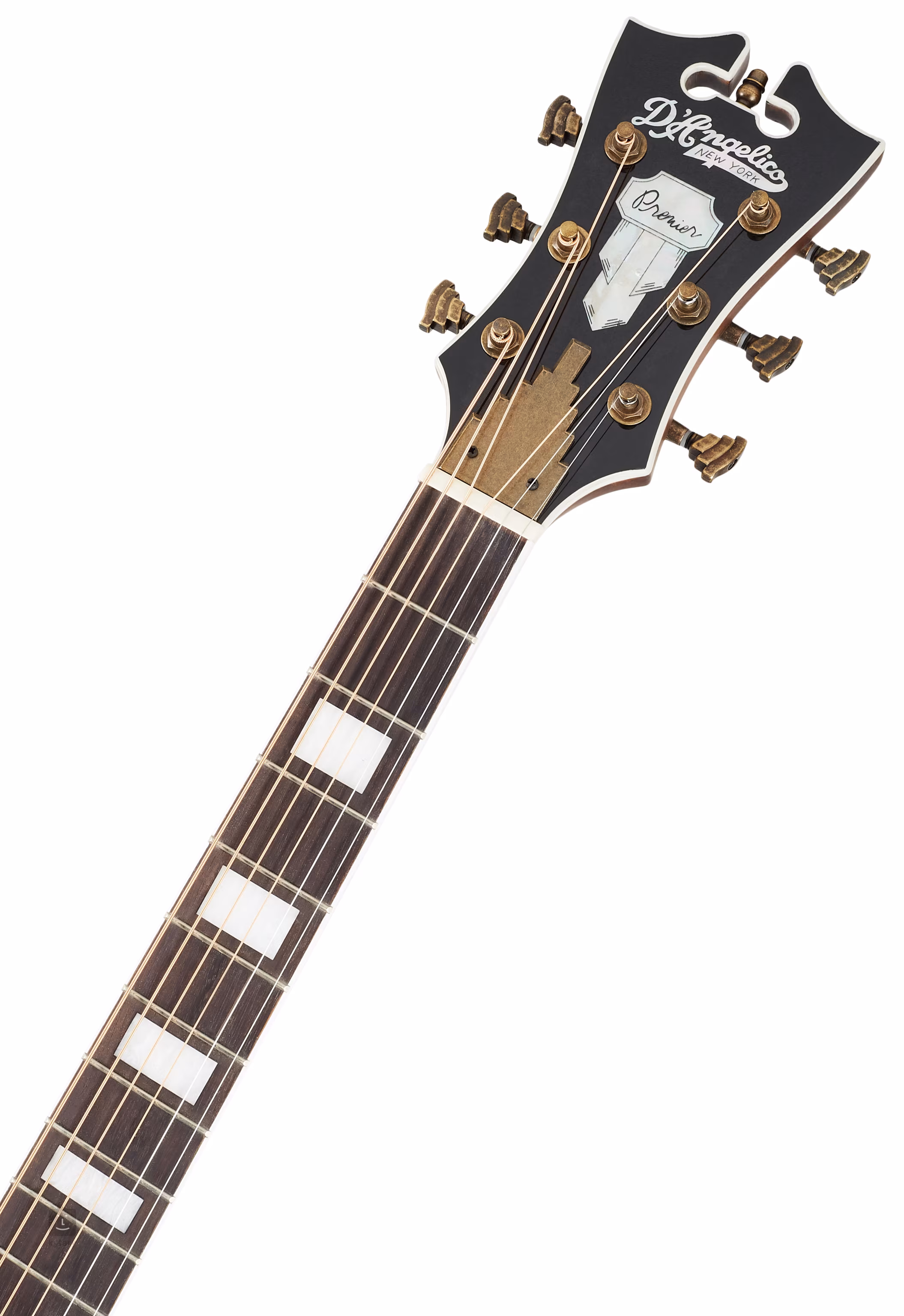 Telo gitary vyvažuje hlavička v tradičnom tvare nástrojov D'Angelico zdobená perleťovým logom spoločnosti. Struny sú namontované v spomínanej antickej bronzovej firemnej mechanike nad sedlom a nultým kosteným pražcom a ovangkolovou hlavou. Vzhľad nástroja dotvára rozeta zložená z perlete (Abalone) a ABS krúžkov, svetlá väzba tela a hmatníka doplnená čiernymi linkami alebo ebenové kolíky v hmatníku s perleťovými bodkami.
