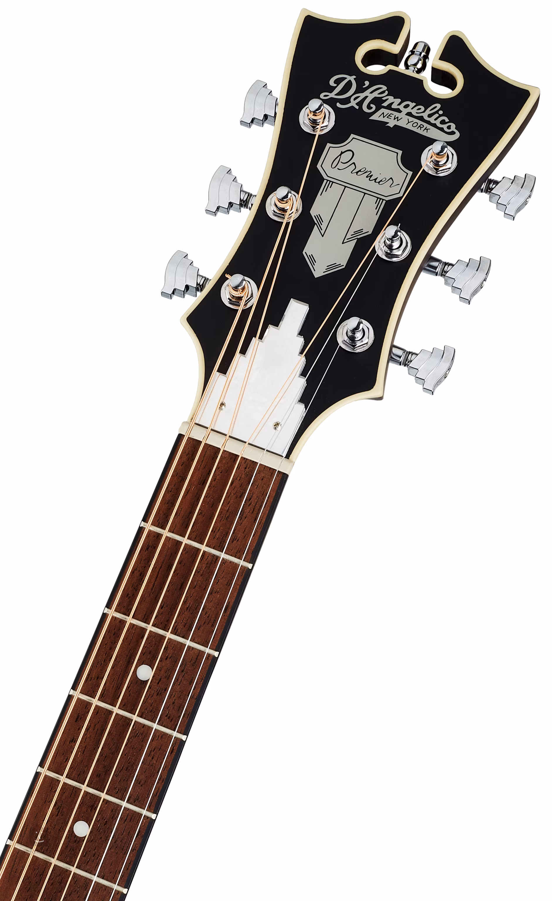 Tělo kytary vyvažuje hlavice v tradičním tvaru nástrojů D´Angelico ozdobená firemním logem z imitace perleti. Struny jsou přes sedlový a nultý pražec z plastového materiálu (PPS) uchyceny v již zmíněných firemních mechanikách v chromovaném provedení a kobylce z merbau. Vzhled nástroje zpestřuje rozeta složená z černobílých prstenců z ABS a černobílá obvodová lemovka těla.