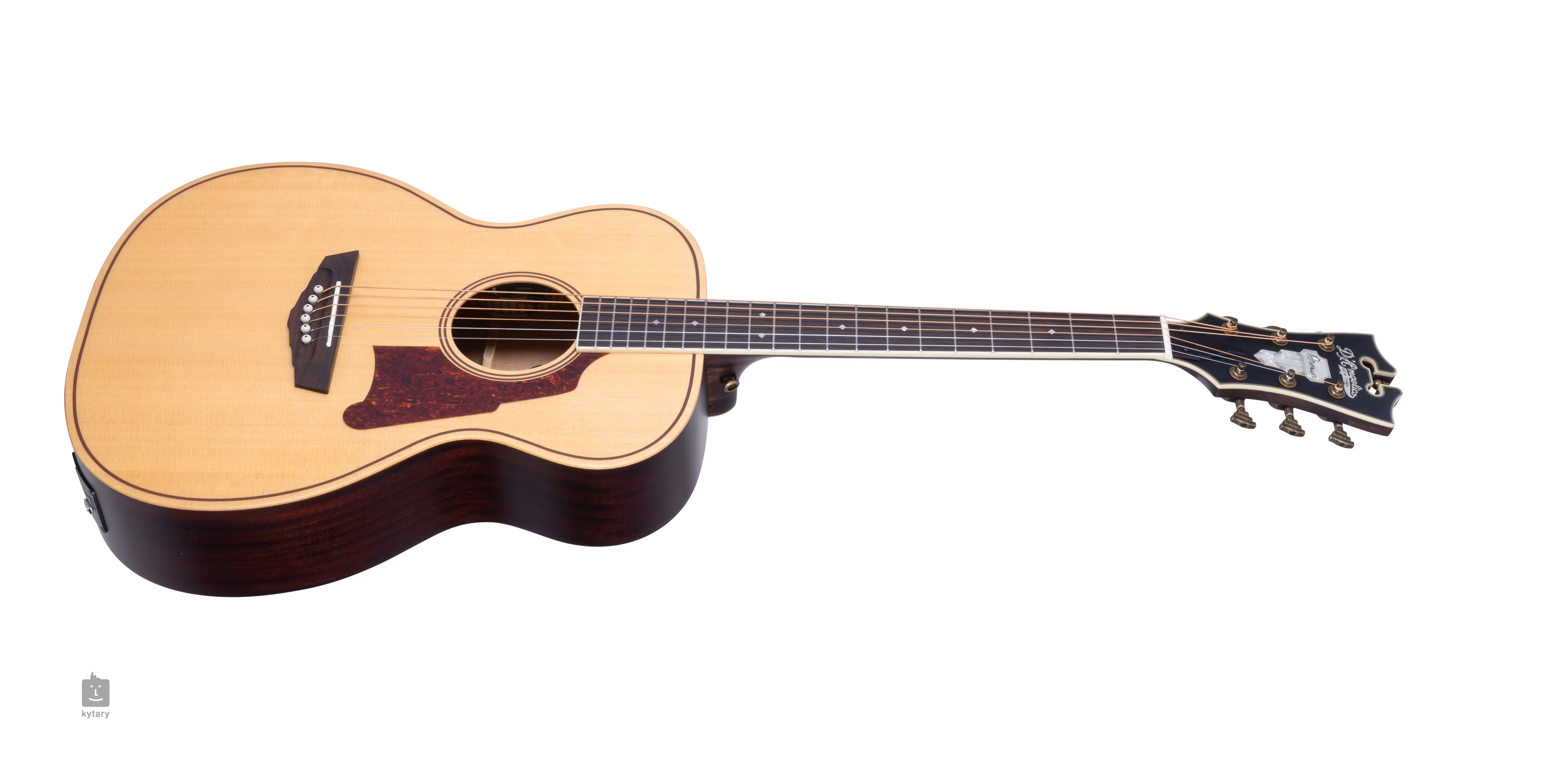 Predná doska modelu PREMIER TAMMANY Orchestra E Natural je vyrobená z masívneho smrekového dreva, zatiaľ čo zadná doska a luby sú z laminovaného sapele. K mahagónovému krku s užším "C" profilom je prilepený palisandrový hmatník s 20 Medium Jumbo pražcami. Orientáciu na hmatníku uľahčujú polohové značky z imitácie perlete v tvare malých diamantov.