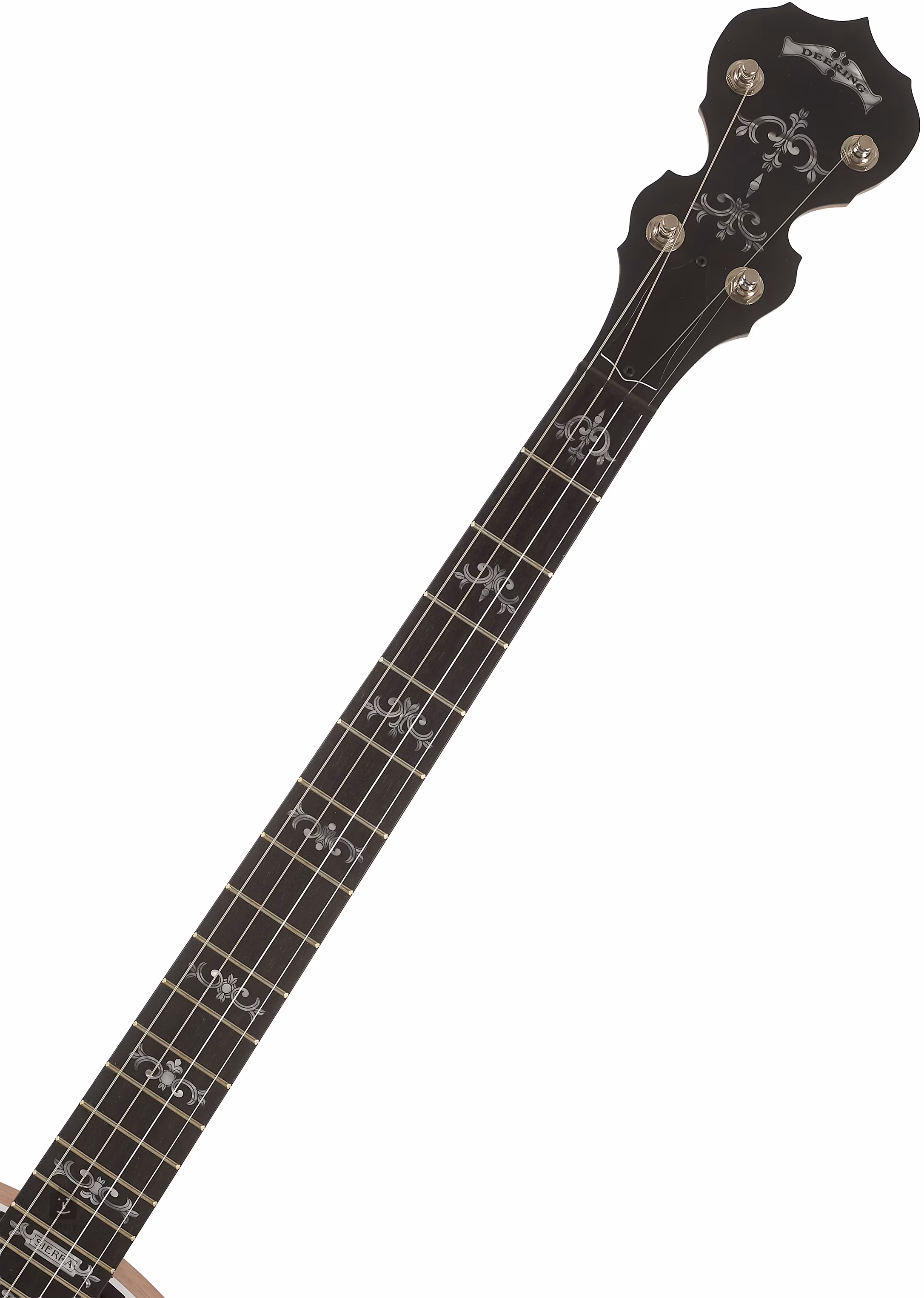 Banjo má tiež mahagónový krk, ebenový hmatník s devätnástimi pakfonovými (niklovo-mosadznými) pražcami, dekoratívne gravírované značky polohy, 11-palcovú hlavu pripevnenú k telu pomocou štandardného napínacieho systému (mosadzný tlakový krúžok, háčiky a dekoratívny zinkový distančný krúžok vyrobený z jedného kusu) a upevnenie strún v tradičných ladiacich mechanikách typu Planetary a javorový/ebenový mostík a niklovaný oceľový strunník Deering True Tone.