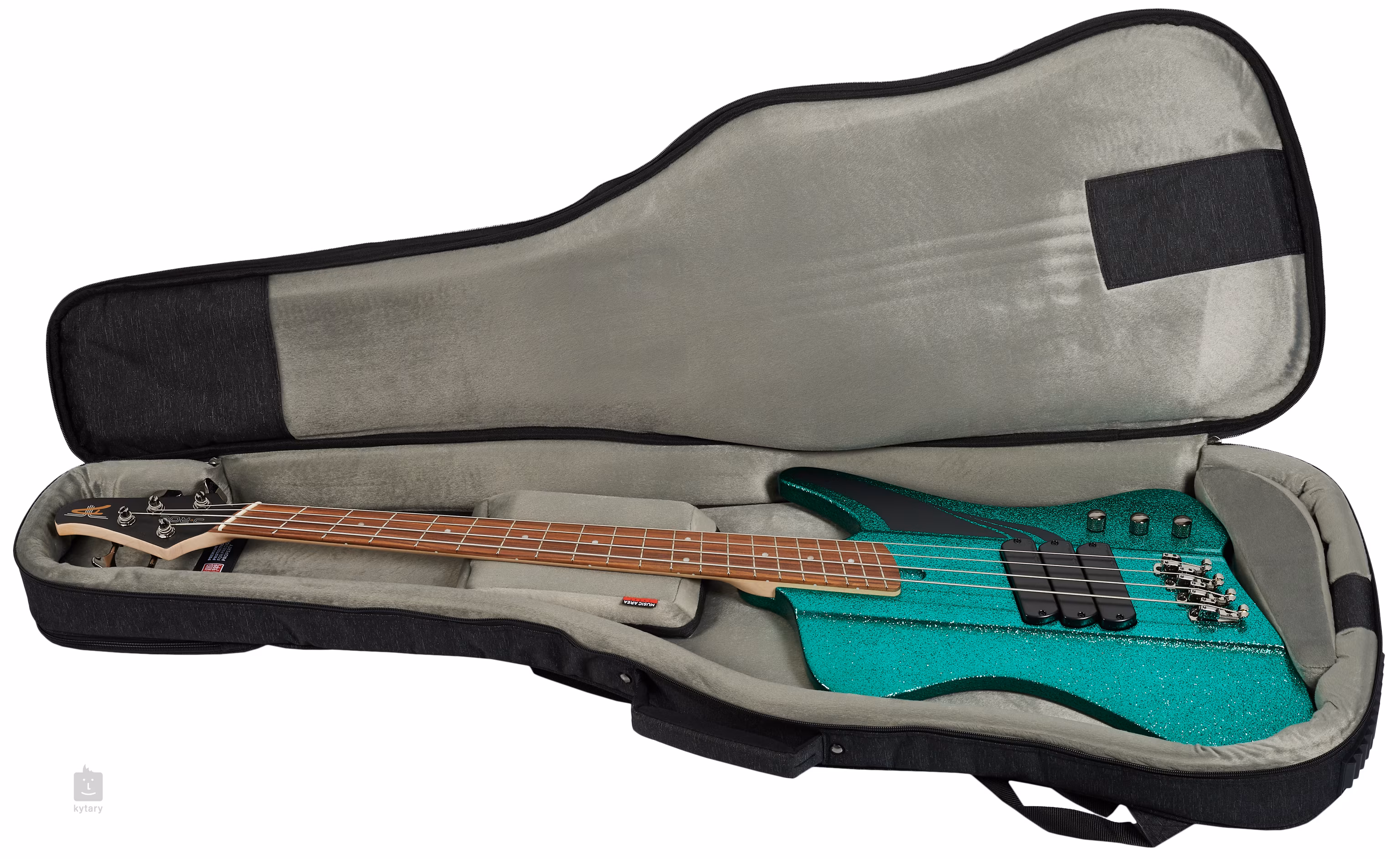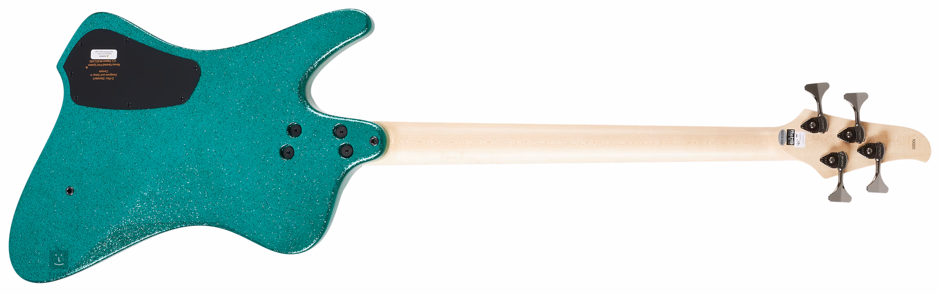 Štvorstrunová basgitara Dingwall zo série D-Roc Standard v trblietavom tyrkysovom prevedení.
