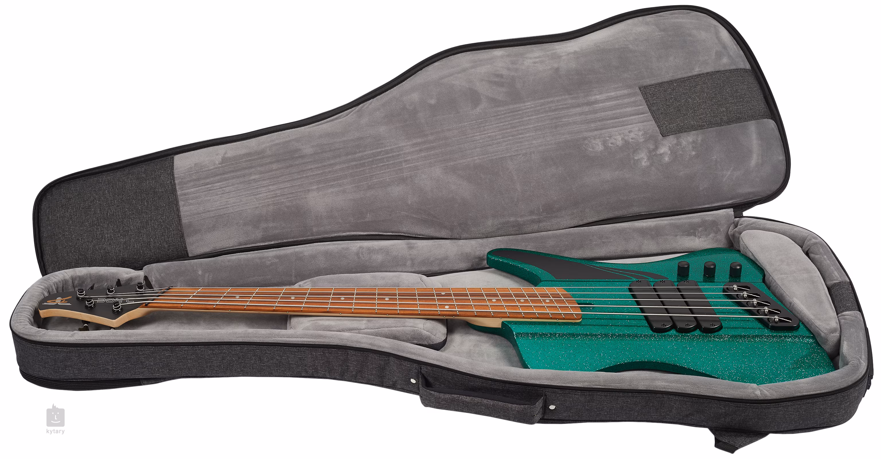 Päťstrunová basgitara Dingwall zo série D-Roc Standard v trblietavom tyrkysovom prevedení.