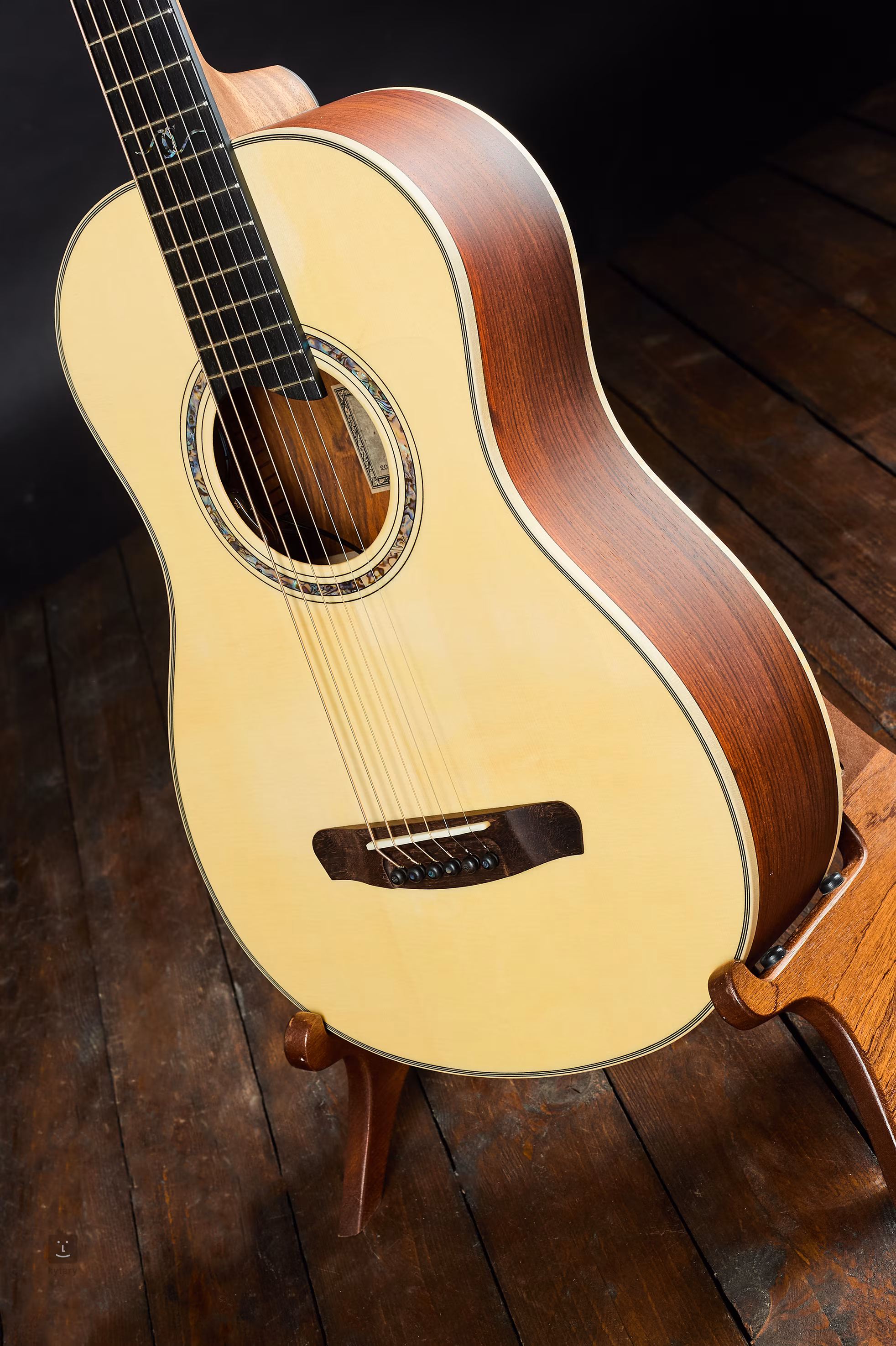 Smreková rezonančná doska. Zadná doska je vyrobená z 2 kusov cocobolo (bežné prevedenie je 3 kusy vzhľadom na vzácnosť tohto materiálu). Kokobolový mech. Nástroj je vybavený ozvučovacím systémom L.R. Baggs Anthem.