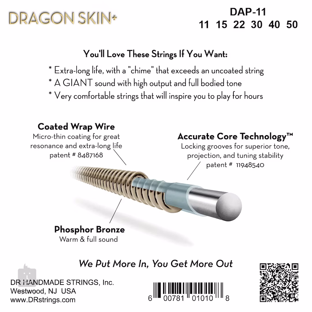 Struny Dragon Skin+ od spoločnosti DR sa vyznačujú veľmi silným a frekvenčne vyváženým tónom. Špeciálny povlak proti korózii im dodáva odolnosť a mimoriadne dlhú životnosť. Okrem toho využívajú patentovanú technológiu Accurate Core, ktorá vďaka jemným drážkam na jadre struny zabezpečuje pevné uchytenie vinutého drôtu, a tým stabilné ladenie a výnimočne prenikavý tón. Struny Dragon Skin+ používajú pre svoje gitary popredné svetové značky ako Godin, Ovation alebo Faith. Táto sada je vyrobená z fosforbronzového materiálu, ktorý ponúka teplý a zaoblený tón.