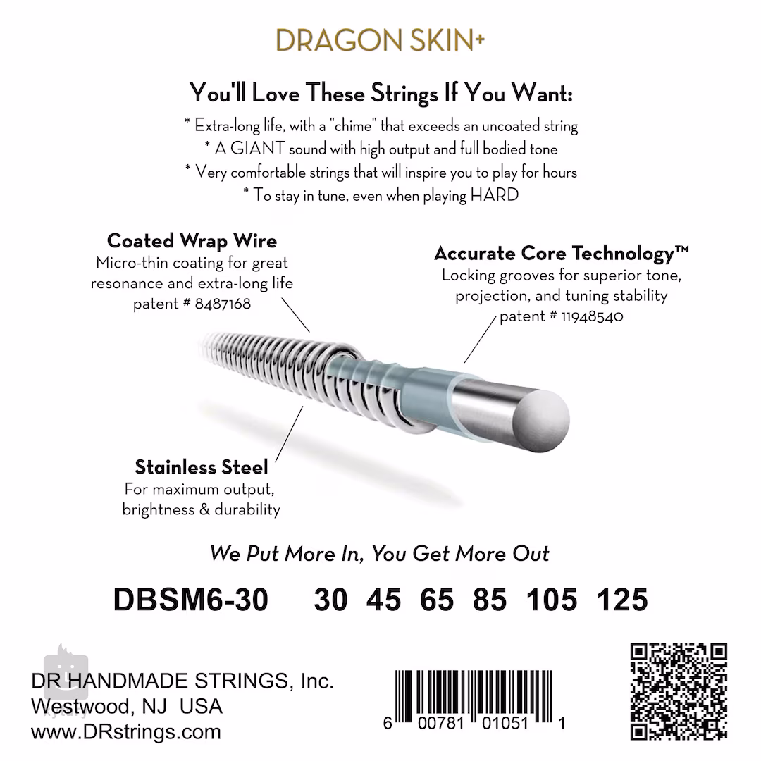 Basové struny Dragon Skin+ od spoločnosti DR vynikajú veľmi silným a frekvenčne vyváženým tónom. Špeciálny antikorózny povlak im dodáva odolnosť a mimoriadne dlhú životnosť. Okrem toho využívajú patentovanú technológiu Accurate Core, ktorá vďaka jemným drážkam na jadre struny zabezpečuje pevné uchytenie vinutého drôtu a tým stabilné ladenie.