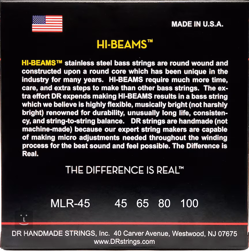 Struny pre elektrické basgitary Hi-Beam značky DR Strings ponúkajú jedinečnú konštrukciu s okrúhlym oceľovým jadrom, ktoré sa pri výrobe basgitarových strún bežne nepoužíva. Ich výroba je časovo náročnejšia a venuje sa jej mimoriadna starostlivosť, vďaka čomu sú struny špičkovo spracované a poskytujú vyššiu mieru flexibility a jasný, prenikavý zvuk. Struny sú obľúbené aj pre svoju odolnosť, dlhú životnosť a vyváženú napätosť vo všetkých strunách. Sada Hi-Beam je ideálna pre hráčov, ktorí hľadajú jasnosť, prenikavosť a pohodlné hranie. Sú vyrobené z obľúbenej nehrdzavejúcej ocele.