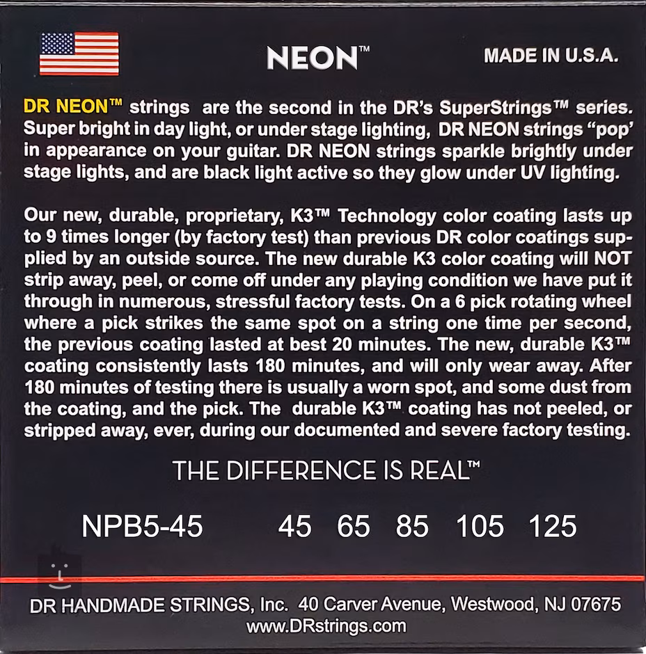 Basové struny Hi-Def NEON Pink od spoločnosti DR Strings vynikajú najmä ružovým neónovým sfarbením, ktoré pod UV svetlom silno žiari. Navyše sú vybavené špeciálnym povlakom K3, ktorý ich chráni pred potom, nečistotami a koróziou. Povlak je nanesený na všetkých strunách v sade, je ultra tvrdý a netlmí vibrácie strún. Výsledkom je lepšia projekcia zvuku, minimalizácia nežiaducich alikvót, vyššia čistota a lepšia artikulácia. Struny sú vyrábané z tých najlepších materiálov v Spojených štátoch amerických. Séria je dostupná v rôznych farbách.