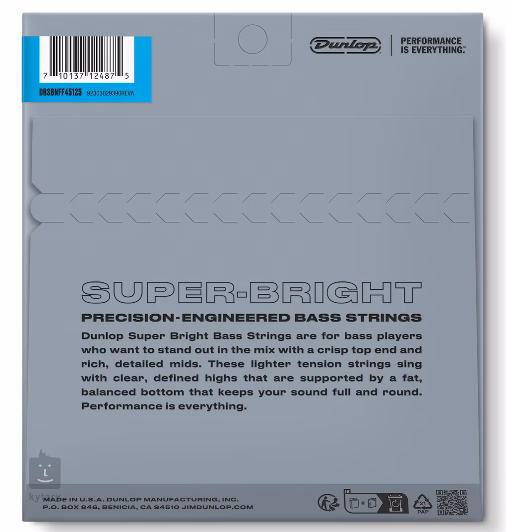 Struny DunlopSuper Bright Nickel Wound pre elektrickú basgitaru boli vytvorené pre basgitaristov, ktorí chcú vyniknúť a zažiariť v každom mixe. Ponúka jasné, ostré výšky a bohaté, prierazné stredy, ktoré stoja na pevnom základe silných, vyvážených basov. Ich oceľové jadro je vinuté poniklovanou oceľou, ktorá zjemňuje ostrý, kovový zvuk čistej ocele a poskytuje frekvenčne vyvážený tón vhodný pre väčšinu žánrov. Či už hráte blues, jazz, rock, punk alebo iné alternatívne štýly, struny Dunlop vás podržia bez ohľadu na to, čo hráte. Model Fan-Fret je určený pre viacstrunové basgitary.