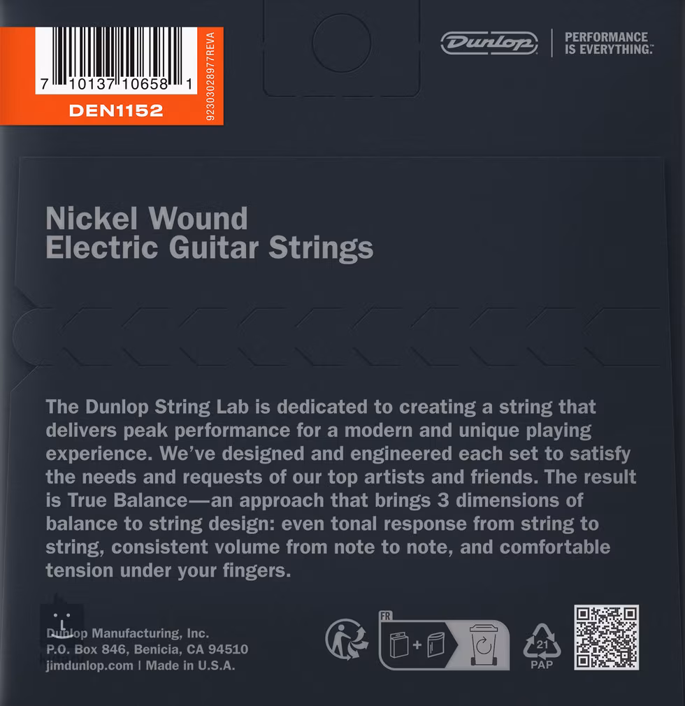 Struny na elektrickú gitaru DunlopNickel Wound sa vyrábajú v Benicia v Kalifornii, kde majú skvelý recept na precízne vyrobené struny z materiálov najvyššej kvality. Sú navinuté niklovanou oceľou a ich zvuk sa vyznačuje frekvenčne vyváženým tónom, ktorý sa dá použiť takmer v každom hudobnom žánri. Nech hráte rock, pop, metal, blues alebo country, tieto struny vám zaručene vydržia. Vynikajú tiež pevnosťou, flexibilitou a pohodlným hraním. Struny sú balené pomocou technológie VCI Fresh Technology, aby ste ich dostali tak čerstvé, ako v deň, keď boli vyrobené.