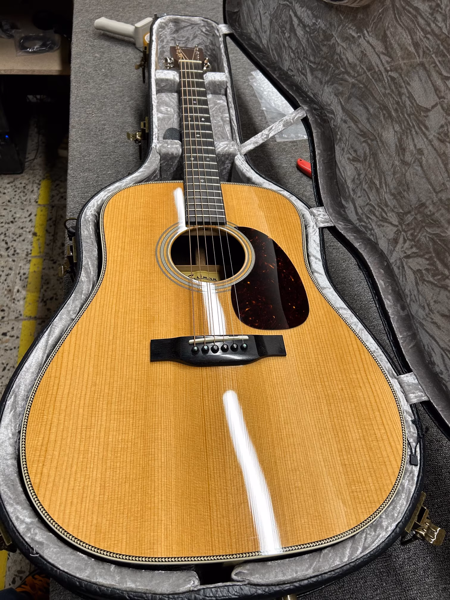 Struny jsou přes nultý pražec z kosti uchyceny v ladících mechanikách Gotoh SE780-06M-N a ebenové kobylce. Pěkné zpracování podtrhuje oboustranná obvodová lemovka těla z imitace slonoviny doplněná výložkou ve vzoru rybí kosti (Herringbone), středový proužek na zadní desce, pickguard z imitace želvoviny, ebenové kolíčky do kobylky s perleťovými očky (Abalone) a perleťové firemní logo na hlavici.