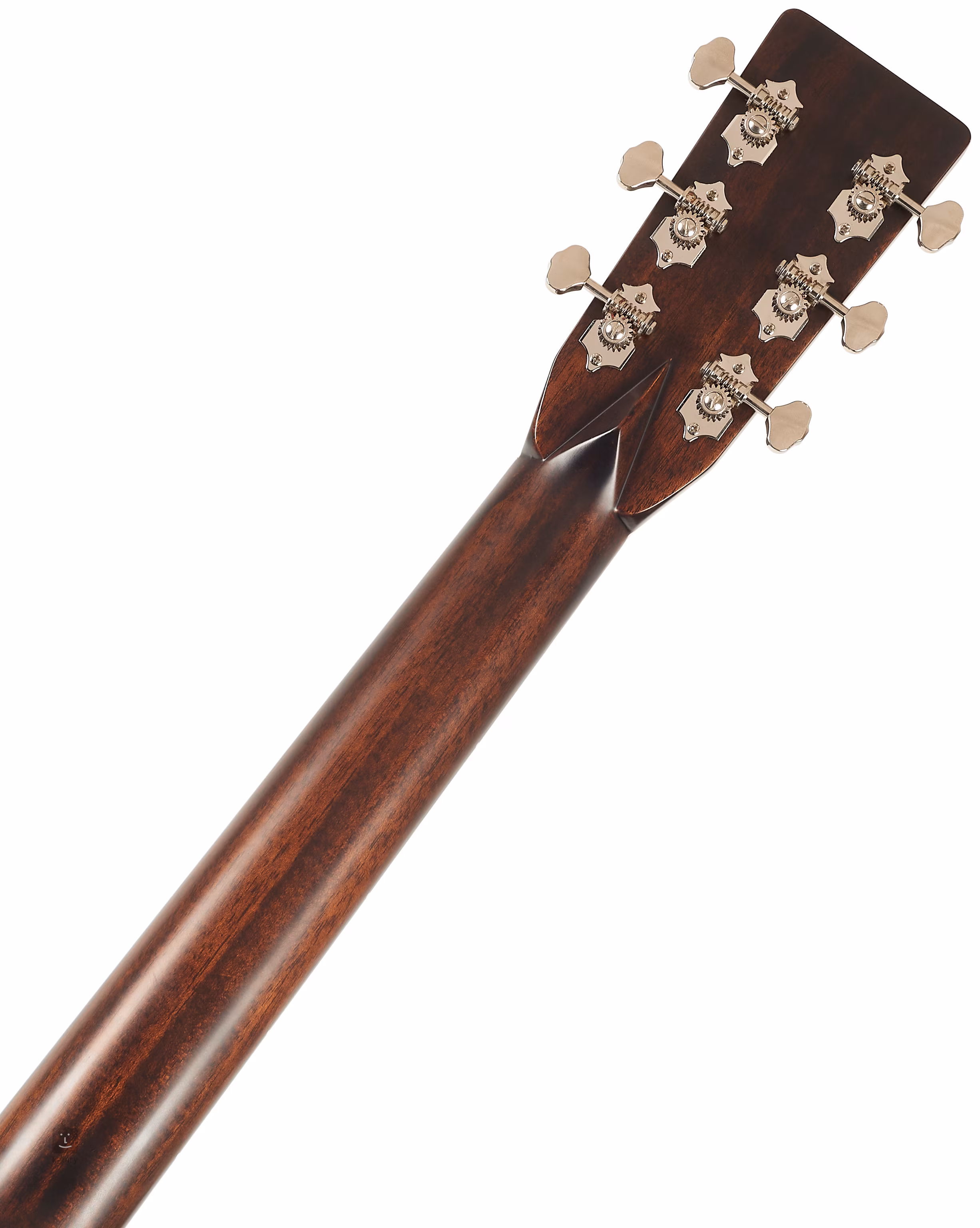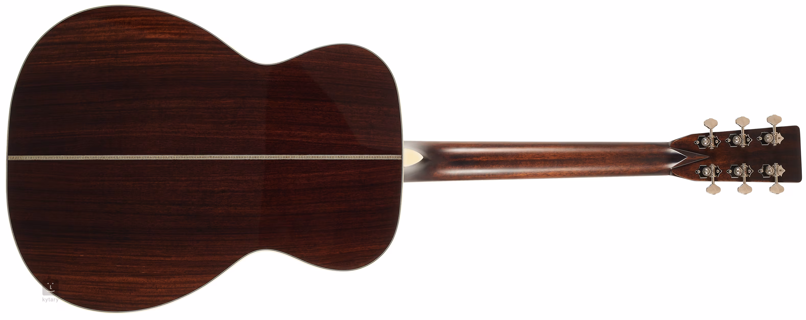 Struny sú uchytené v ladiacich mechanikách Gotoh SE780-06M-N a ebenovej hlavici prostredníctvom kosteného pražca. Pekné spracovanie podčiarkuje obojstranná väzba tela z imitácie slonoviny doplnená o jazýček Herringbone, stredový prúžok na zadnej doske, pickguard z imitácie korytnačky a perleťové firemné logo na hlavici.
