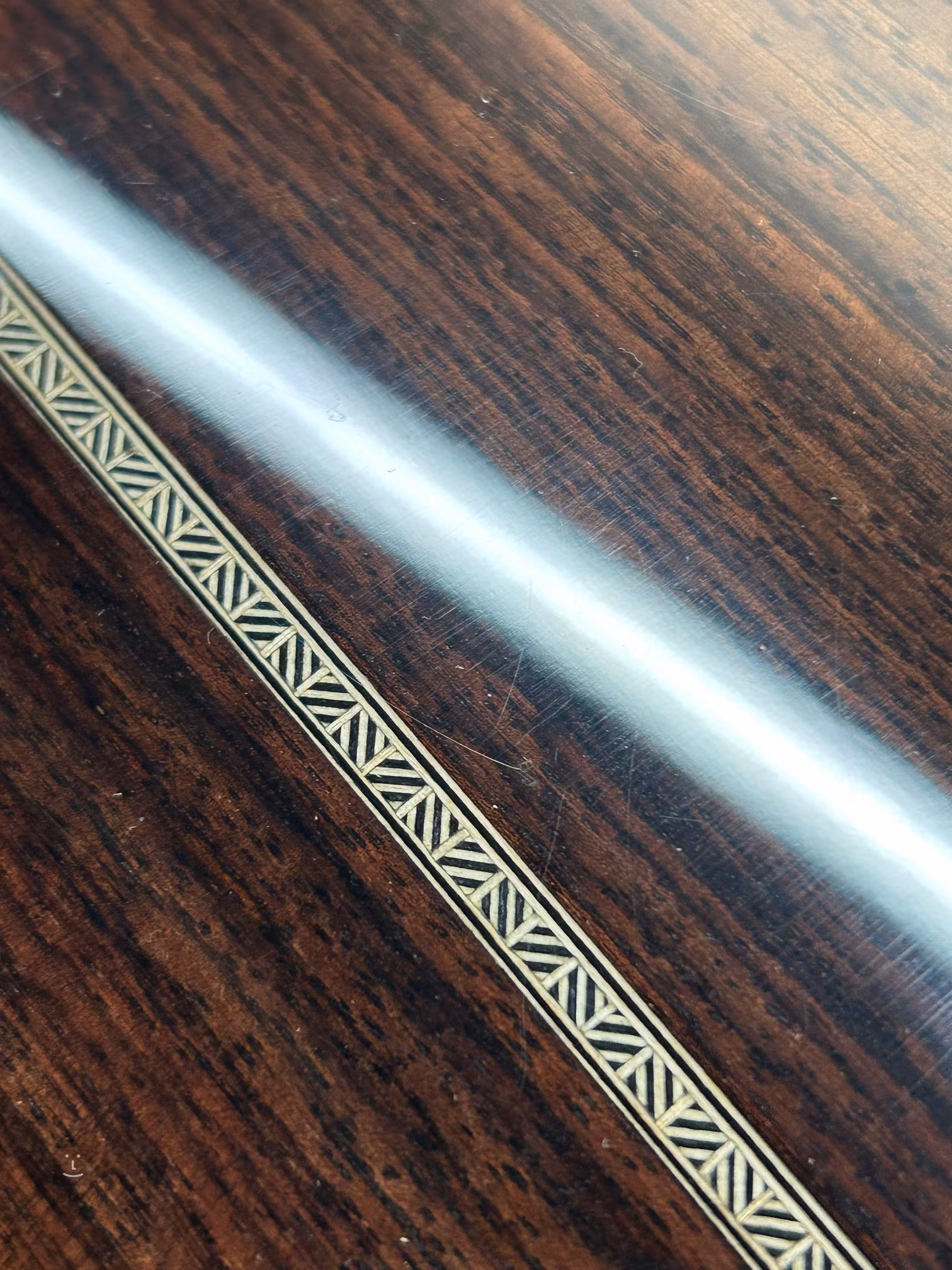 Struny sú ukotvené nad kostnatým nultým pražcom v niklových ladiacich mechanikách s otvoreným prevodom (Open-Gear PingWell V93N 3+3) a ebenovým mostíkom. Krásne remeselné spracovanie podčiarkuje obojstranné lemovanie z imitácie slonoviny okolo tela, doplnené vzorom rybieho kosti na vrchnej doske, stredovým pruhom na zadnej strane, imitáciou želvovinového chráma a perleťovým logom spoločnosti na hlave.