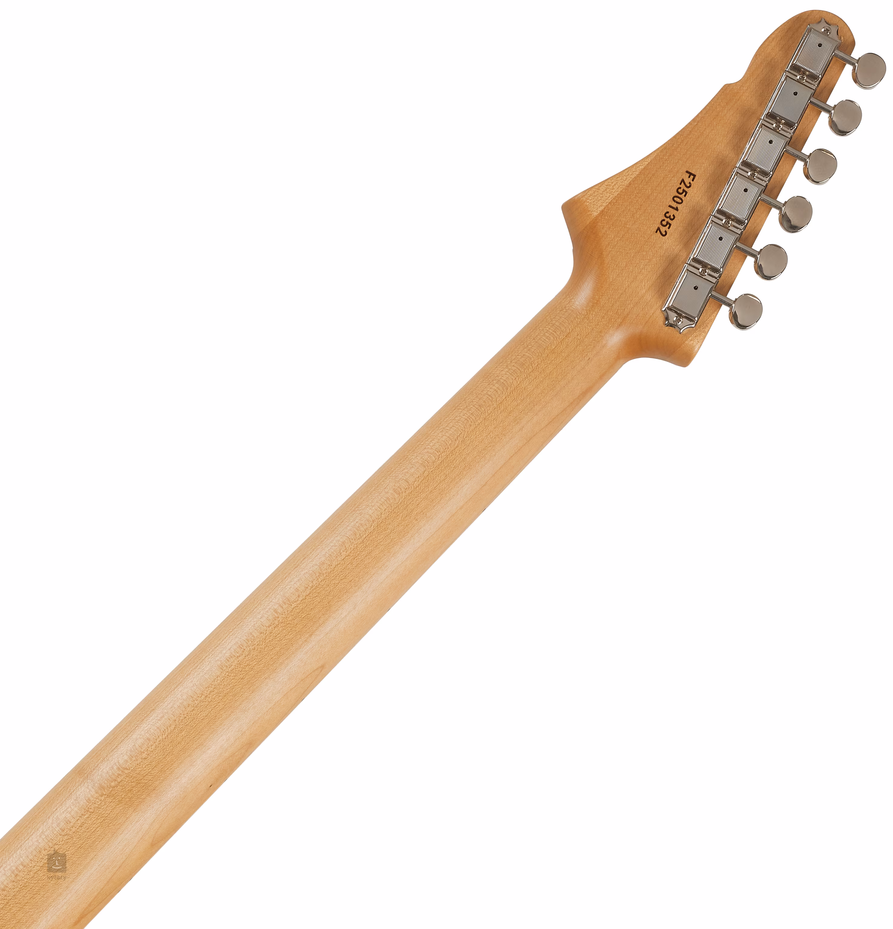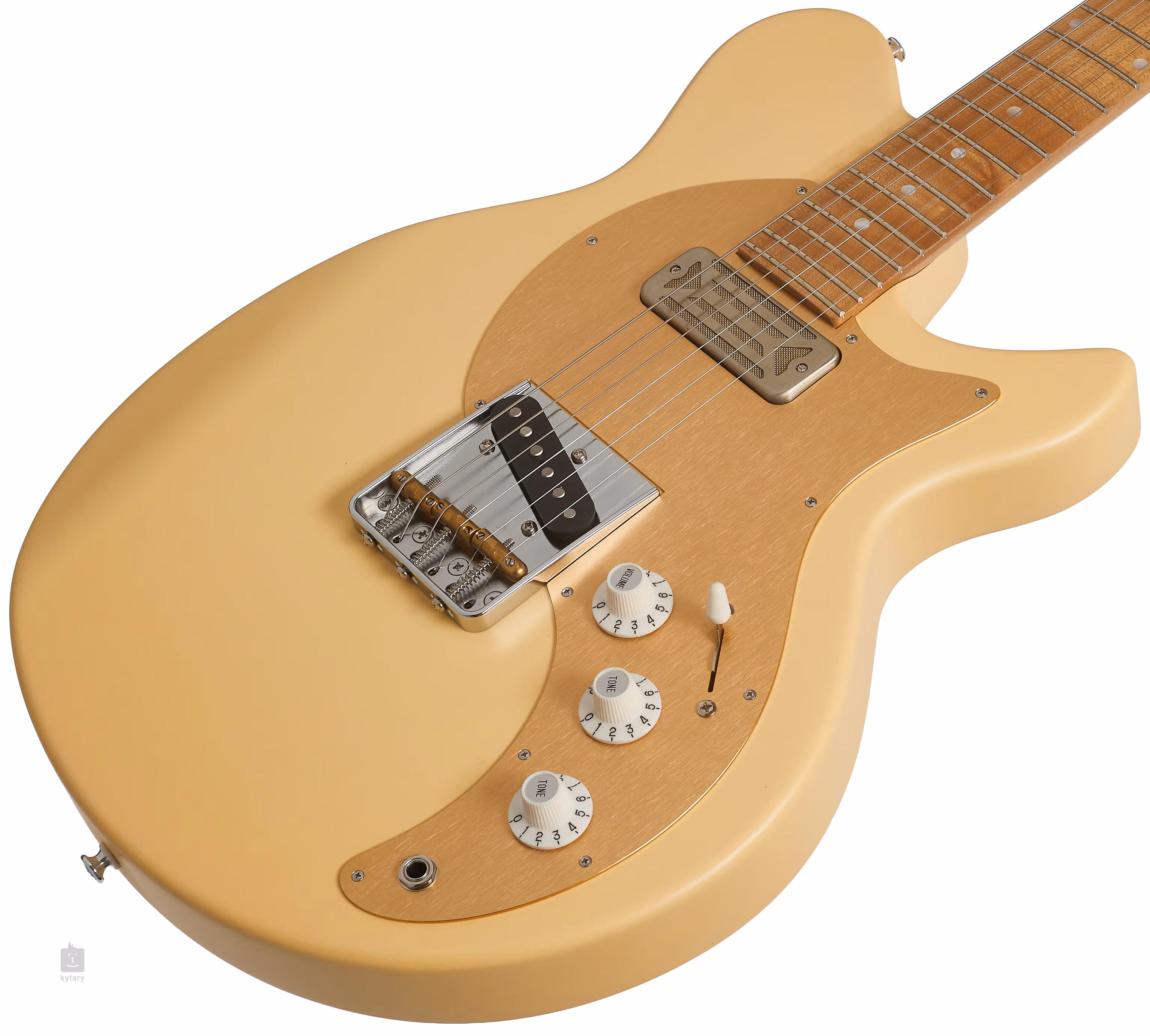 Zvuk bezšumového stohovateľného single-coil mostíka Tonerider a zákazkového zlatofóliového humbuckera soapbar pri krku kombinuje vintage hrejivosť s čistou odozvou moderných snímačov. Charakter zvuku si môžete nastaviť pomocou štandardných potenciometrov. Stabilné ladenie a dobrý sustain zaručuje uchytenie strún v mechanike so šiestimi strunami a prostredníctvom mostíka v štýle T s kompenzovanými mosadznými sedlami cez telo. Pekné spracovanie podčiarkuje pickguard zo zlatého eloxovaného hliníka a niklový hardware.