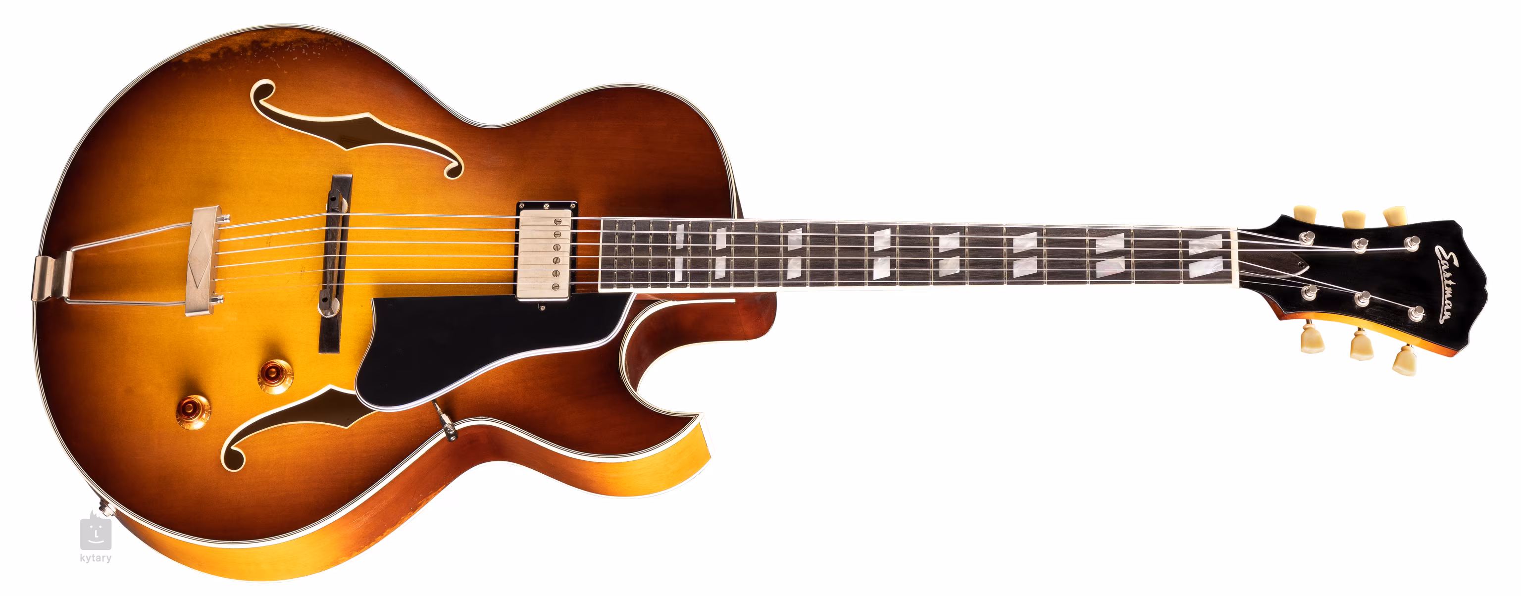 Humbucker Lollar Custom Wound Imperial pri krku poskytuje gitare čistý teplý a dynamický zvuk snímačov PAF z 50. rokov, ktorý vynikne v jazze a blues. Charakter zvuku si môžete upraviť pomocou štandardných ovládacích prvkov. Struny sú osadené v ladiacich mechanikách Gotoh SD90-Relic a cez nastaviteľný ebenový hmatník v kovovom pickguarde. Jemné remeselné spracovanie podčiarkuje tenký ručne nanášaný lak (Antique Varnish) používaný aj na strunových nástrojoch Eastman, obojstranné lemovanie tela, hmatníka a F-otvoru imitáciou slonoviny, čierne lemovaný pickguard, hardware s jemnými prvkami patiny (Aged Nickel) a perleťové firemné logo na hlavici.