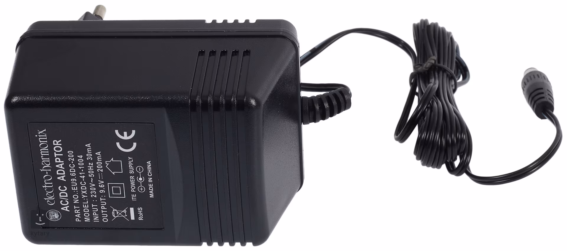 Napájací adaptér Electro Harmonix 9,6 V je 9,6 V napájací zdroj pre zariadenia s maximálnym odberom 200 mA DC. Konektor je rovný so štandardným vnútorným priemerom 2,1 mm (Center Negative).