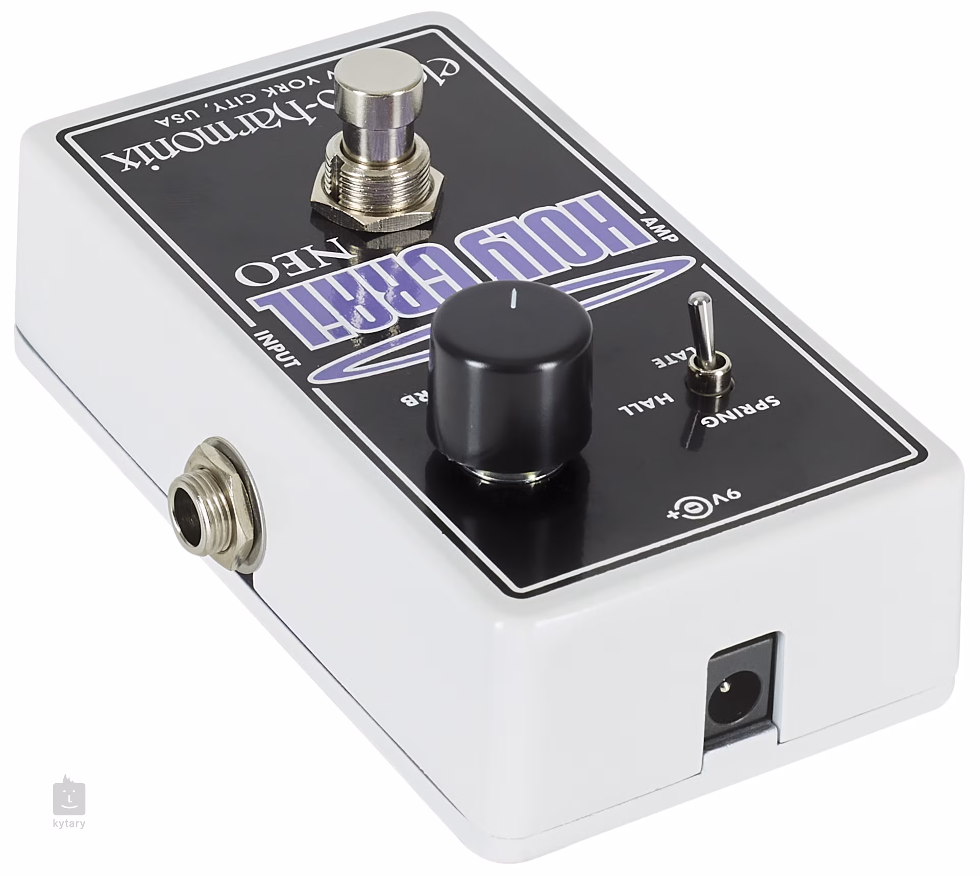 EHX Holy Grail Neo je digitálny reverb v kompaktnom "pedalboard-friendly" formáte, ktorý ponúka tri populárne typy reverbových efektov - simulovaný lampový reverb (SPRING), priestorový HALL reverb a PLATE, ktorý napodobňuje štúdiové reverby zo 60. a 70. rokov. Jediný ovládací prvok v boxe určuje mix čistého a spracovaného signálu (dry/wet). Všetka elektronika je umiestnená v odolnom šasi. Box pracuje v režime true bypass, takže vo vypnutom stave neovplyvňuje priepustný signál. Napájanie zabezpečuje priložený adaptér.