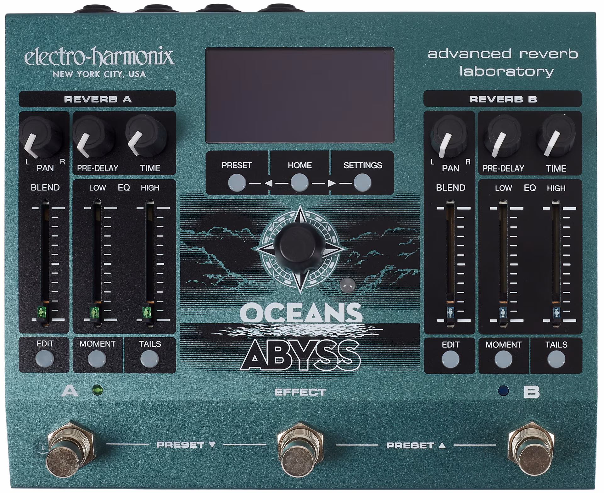 Gitarový box Oceans Abyss od spoločnosti Electro-Harmonix je flexibilná reverbová laboratória, ktorá je postavená na dvoch nezávislých reverbových motoroch (Reverb A a Reverb B). Tie vám okrem prémiových stereo reverbov, ako sú Room, Hall, Spring, Plate, Reverse, Dynamic, Auto-Infinite, Shimmer, Polyphonic a Resonant, poskytnú celý rad efektov a spolu s nimi aj osem efektových blokov, z ktorých si môžete jednoducho zostaviť vlastný efektový reťazec. Každý z enginov umožňuje vybudovať nezávislú efektovú cestu a potom ju paralelne alebo sériovo kombinovať s druhou signálovou cestou. Vďaka tomu môžete vytvárať rozmanité zvukové kombinácie a budovať stereo zvukové plátna, ktoré pohltia vás aj vašich poslucháčov.