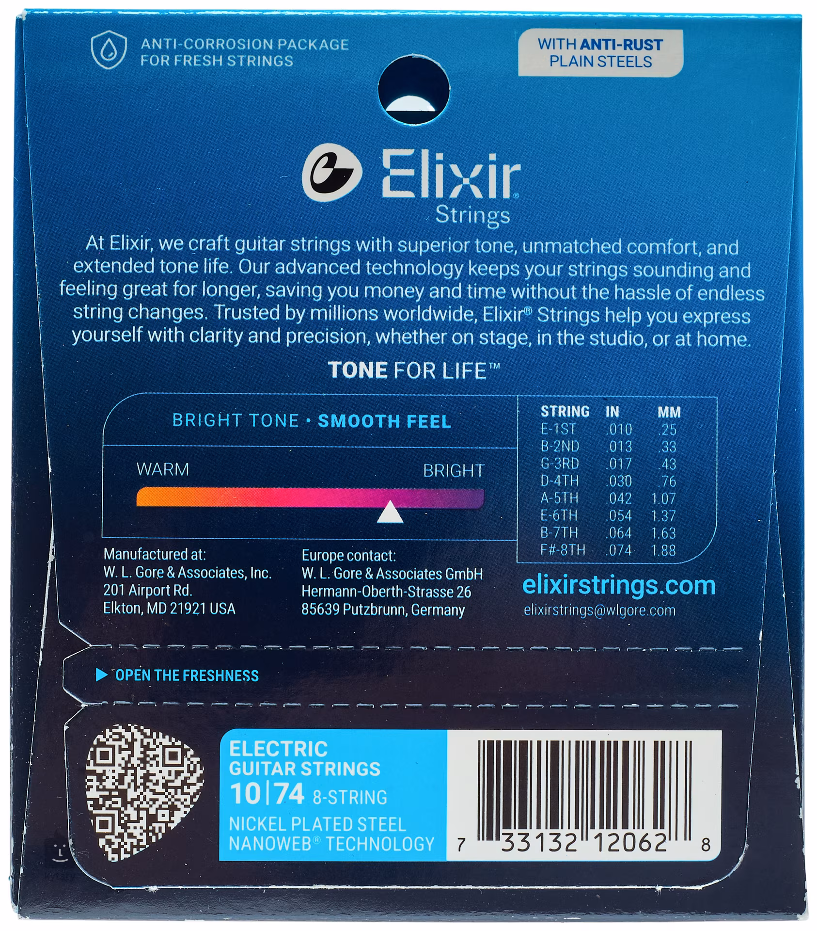 Struny Elixir sú známe svojou mimoriadne dlhou životnosťou, s ktorou je veľmi ťažké konkurovať. Vďaka špeciálnej povrchovej úprave sú odolné voči korózii, vlhkosti, nečistotám a potu, takže si dlho zachovávajú svoj jasný a prenikavý tón. Z hľadiska zvuku ide o veľmi silné poniklované oceľové struny s výrazným charakterom. Táto sada je potiahnutá ochrannou vrstvou Nanoweb, vďaka čomu sú struny mimoriadne odolné a hladšie ako bežné struny. Povlak Nanoweb je ešte tenší ako verzia Polyweb, takže takmer vôbec netlmí prirodzené správanie a zvuk strún. Vaša gitara si zachová jasný a prenikavý zvuk.