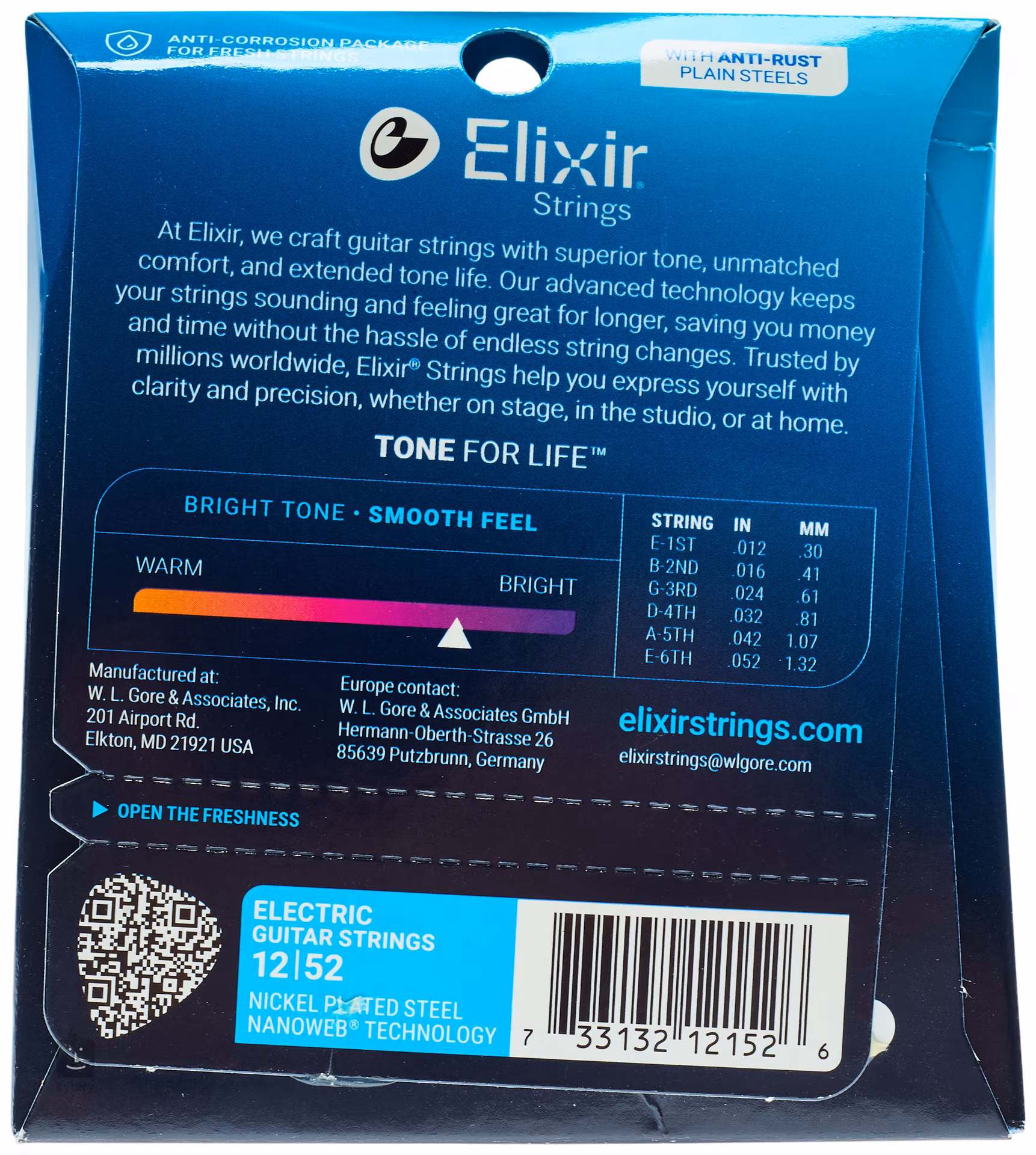 Struny Elixir sú známe svojou mimoriadne dlhou životnosťou, s ktorou je veľmi ťažké konkurovať. Vďaka špeciálnej povrchovej úprave sú odolné voči korózii, vlhkosti, nečistotám a potu, takže si dlho zachovávajú svoj jasný a prenikavý tón. Z hľadiska zvuku ide o veľmi silné poniklované oceľové struny s výrazným charakterom. Táto sada je potiahnutá ochrannou vrstvou Nanoweb, vďaka čomu sú struny mimoriadne odolné a hladšie ako bežné struny. Nanowebový povlak je ešte tenší ako verzia Polyweb, takže takmer vôbec netlmí prirodzené správanie a zvuk strún. Vaša gitara si zachová jasný a prenikavý zvuk.