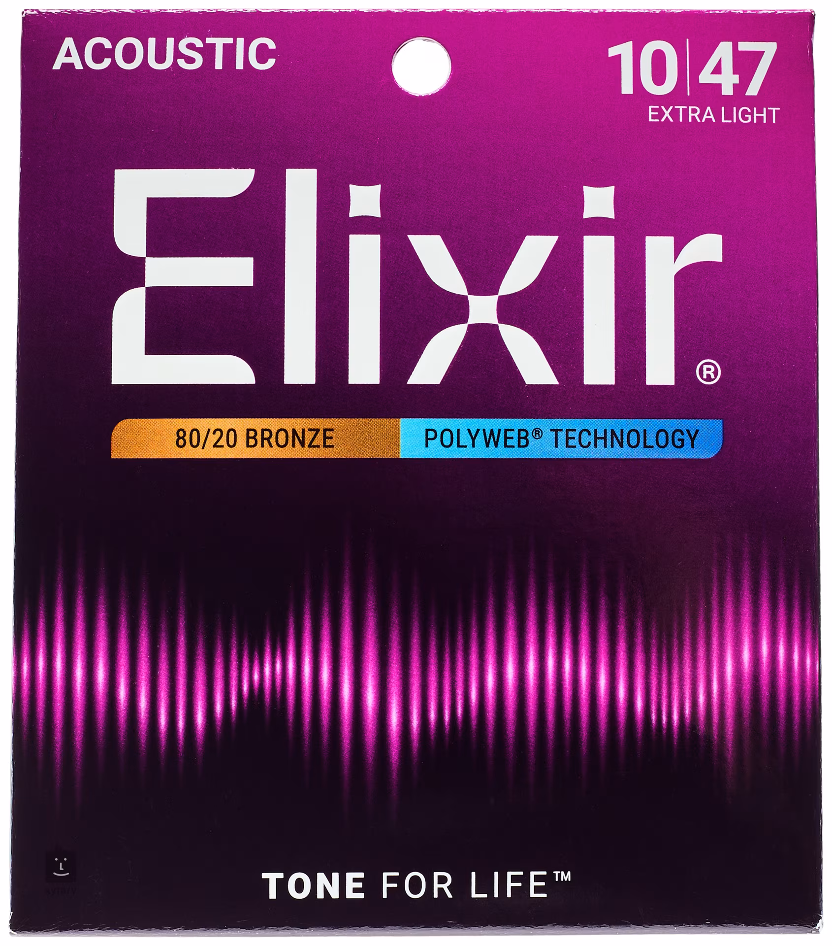 Struny Elixir sú známe svojou mimoriadne dlhou životnosťou, ktorej je veľmi ťažké konkurovať. Vďaka špeciálnemu povlaku sú odolné voči korózii, vlhkosti, nečistotám a potu, takže si dlho zachovávajú jasný a prenikavý tón. Zvukovo ide o veľmi silné a rezonujúce struny, ktoré vyniknú na akomkoľvek pódiu alebo nahrávke. Struny s označením 80/20 Bronze majú vinutie vyrobené z bronzovej zliatiny (80/20), ktorá im dodáva prenikavý a zvonivý charakter. Táto sada strún je však potiahnutá ochrannou vrstvou Polyweb, ktorá mierne tlmí ich zvonivosť, takže získate tlmený a teplejší tón.