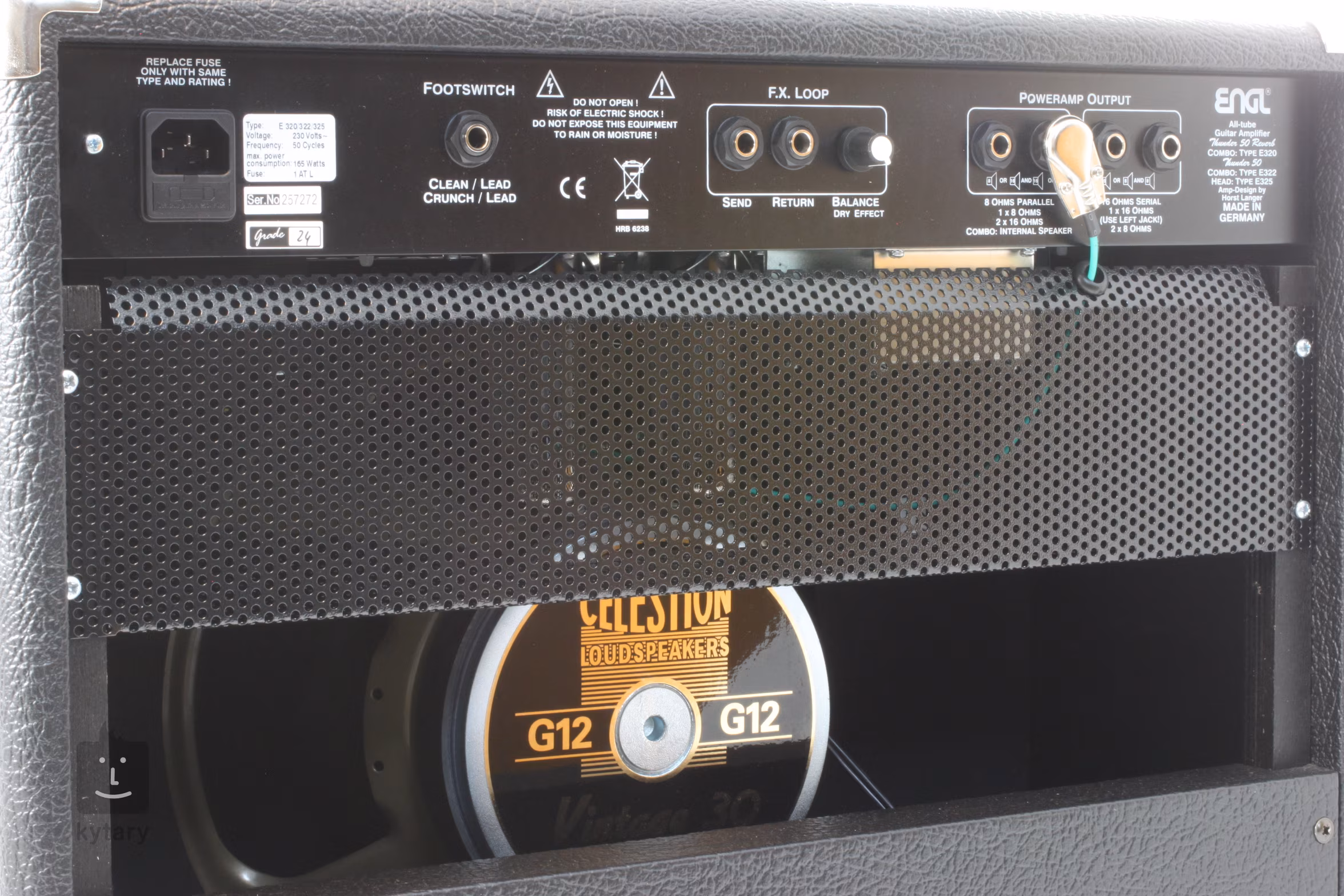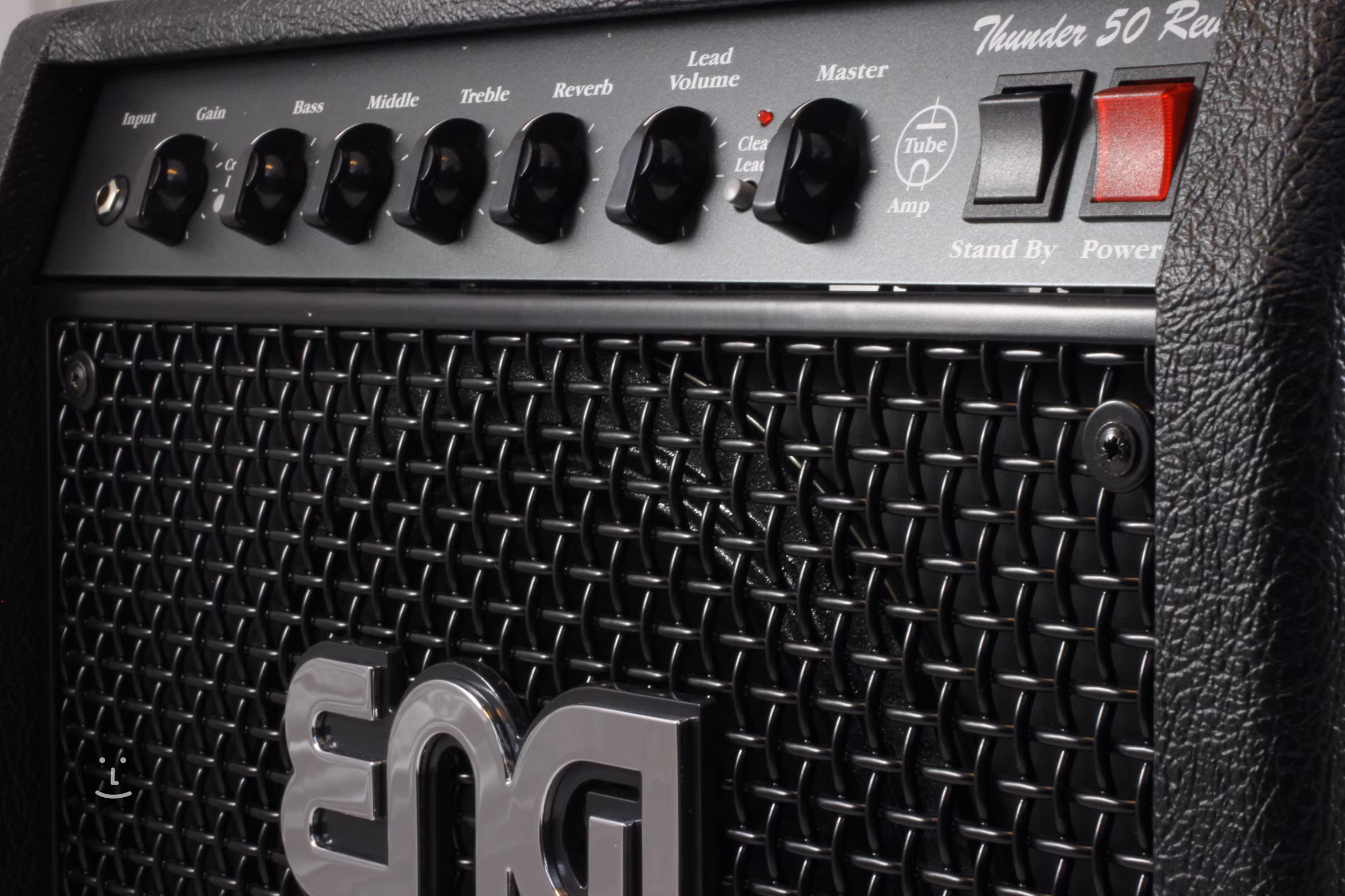 Jak již bylo řečeno, výkon Thundera je 50 wattů, které mu dodává koncový zesilovač osazený dvěma elektronkami typu 6L6. V předzesilovači najdete 3 lampy, a to modely ECC83, jedna ECC83 se ale nachází i v koncové sekci zesilovače. Celkem tato hlava nabízí 3 kanály – Clean, Crunch a Lead s jedněmi společnými korekcemi. V kabinetu je zabudován 12-palcový reproduktor Celestion V30, který sám o sobě je zárukou kvalitního zvuku