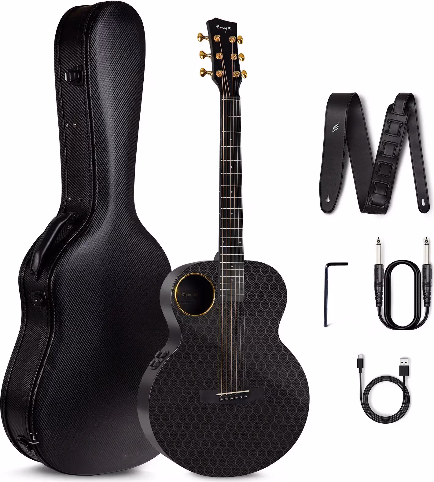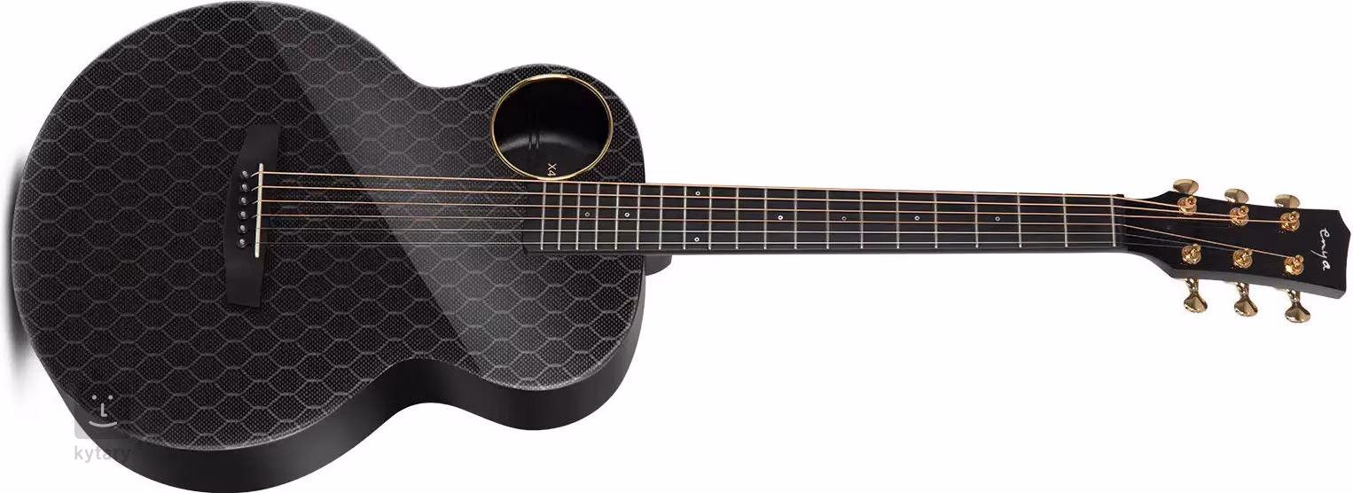 Elektroakustická gitara Enya X4 Pro Mini AcousticPlus Black s kratšou menzúrou sa od väčšiny produkcie tejto značky líši svojím relatívne tradičným dizajnom, ale ako sa dalo očakávať, vzhľad môže klamať. Rovnako ako ostatné časti gitary je vyrobená z uhlíkového kompozitu, materiálu, ktorý je úplne odolný voči zmenám počasia, teploty alebo vlhkosti. Krk je vystužený zliatinou hliníka. Neobvykle umiestnený zvukový otvor so zlatým okrajom zaisťuje dobrú projekciu zvuku.