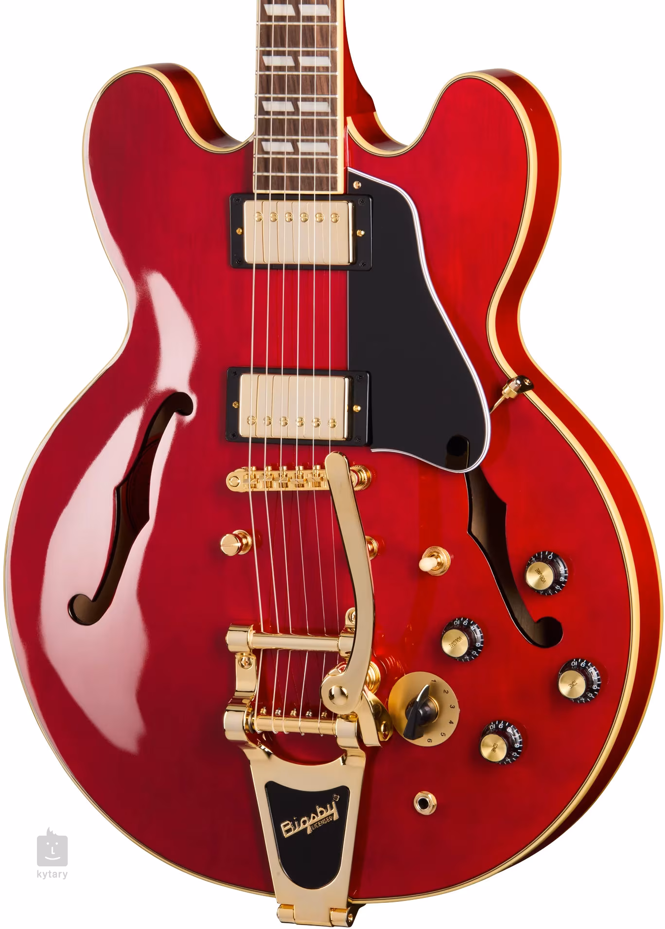 Dvojica snímačov Alnico Classic PRO dodáva gitare bohatý, teplý zvuk vintage PAF humbuckerov. Charakter zvuku môžete nastaviť pomocou ovládačov hlasitosti a tónu, prepínača Varitone a trojpolohového prepínača snímačov. Struny sú ukotvené na Graphtech nultej pražci vo vintage štýle s Keystone kolíkmi a cez LockTone TOM mostík v Bigsby B70 tremolo. Krásne remeselné spracovanie podčiarkujú zlaté kovové časti, obojstranné lemovanie tela a hmatníka, čierny chránič ES-335 a perleťové logo a intarzia Gibson Crown na hlave.