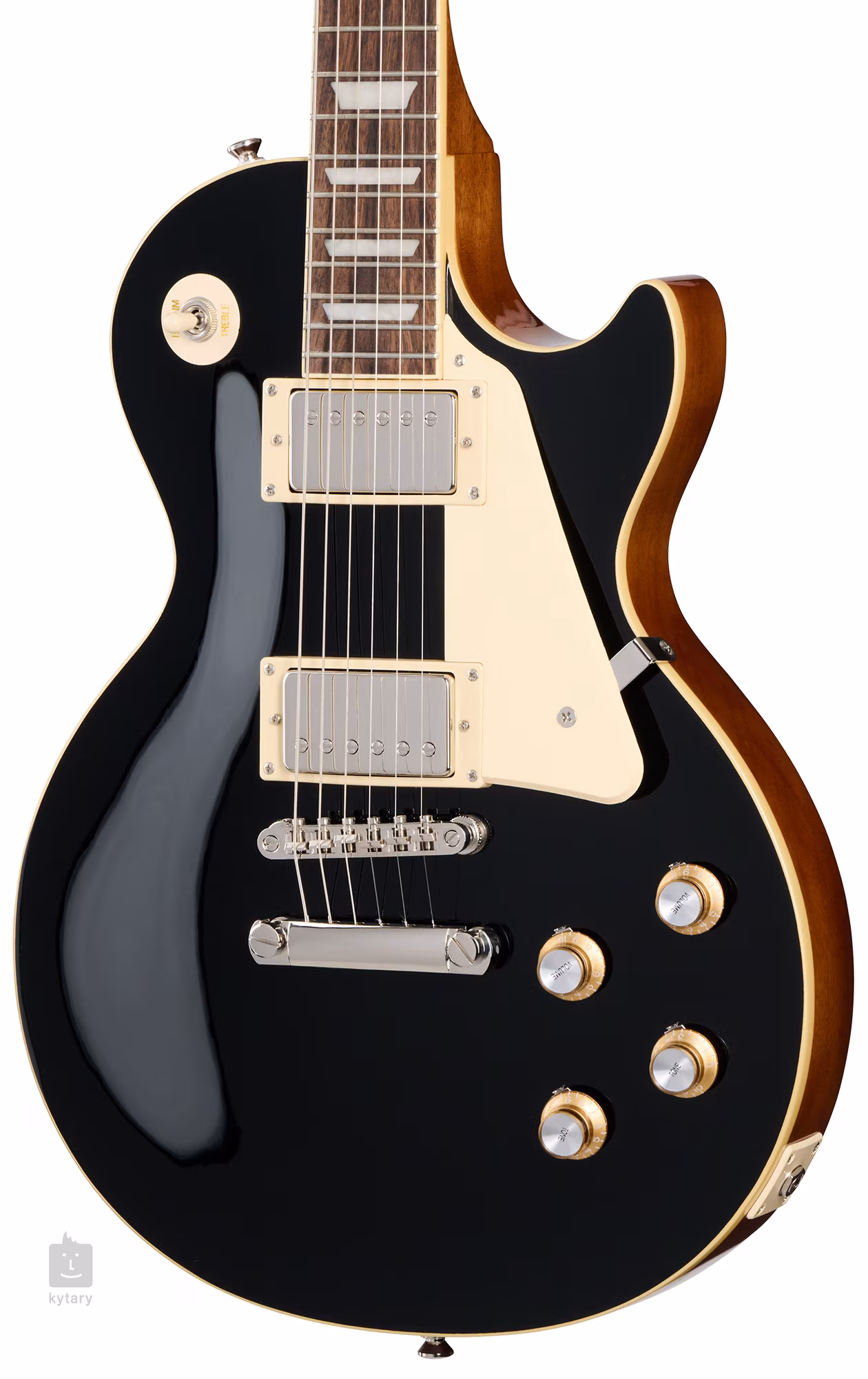 Struny sú uchytené v kvalitných ladiacich mechanikách Grover Rotomatic s kolíkmi Kidney a cez nastaviteľnú kobylku LockTone TOM v strunníku. Štýlový dizajn podčiarkuje svetlé obvodové lemovanie tela a hmatníka a krémový pickguard.