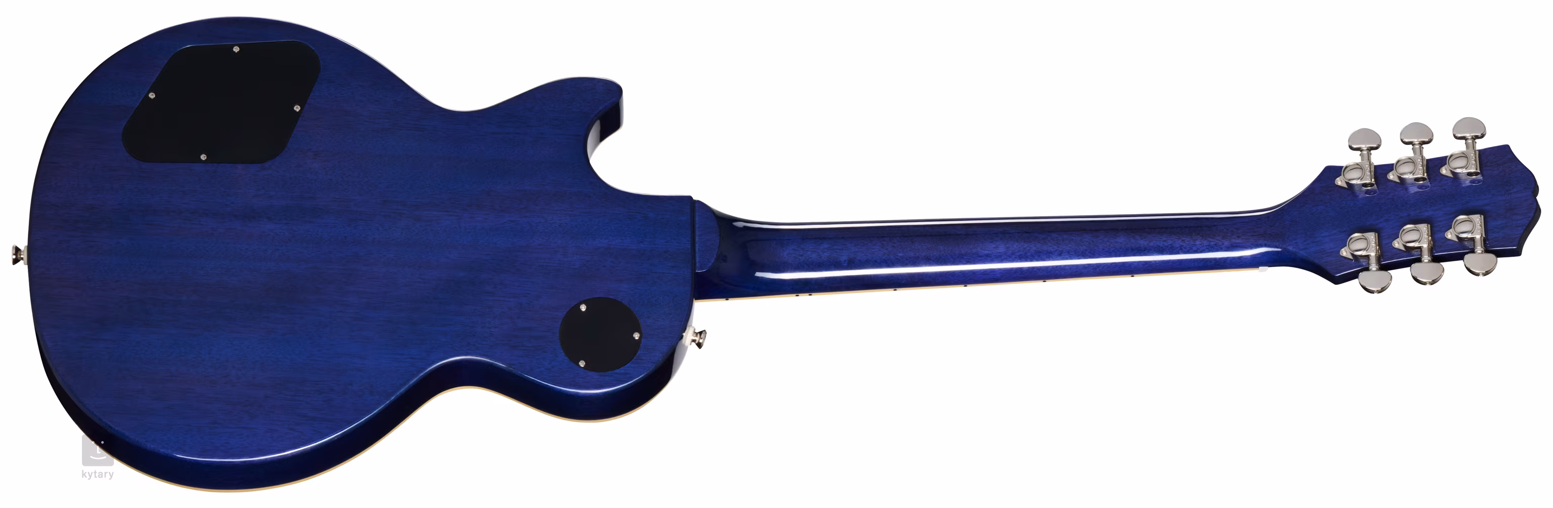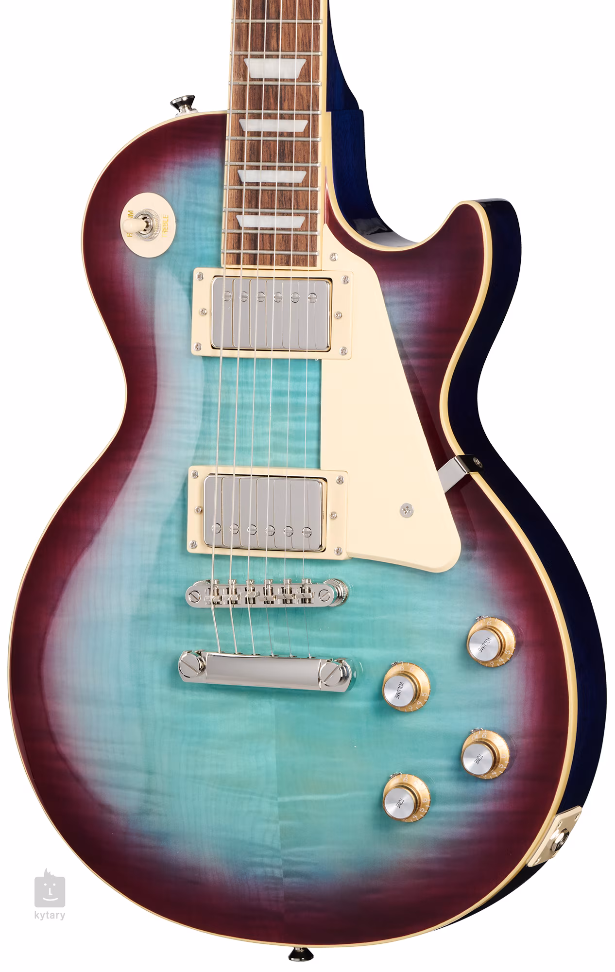 Telo elektrickej gitary Les Paul Standard 60s Figured Blueberry Burst je vyrobené z okoumé (mahagón gaboon) a je vybavené vrchnou doskou z figurovaného javora kvality AAA. Figúrovaný javor je zvýraznený lesklou lakovou úpravou. Mahagónový krk s pohodlným a rýchlym profilom SlimTaper 60s "C" je prilepený k figovému hmatníku osadenému dvadsiatimi dvoma Medium Jumbo pražcami. Polohovacie bloky z imitácie perlete uľahčujú orientáciu na hmatníku.