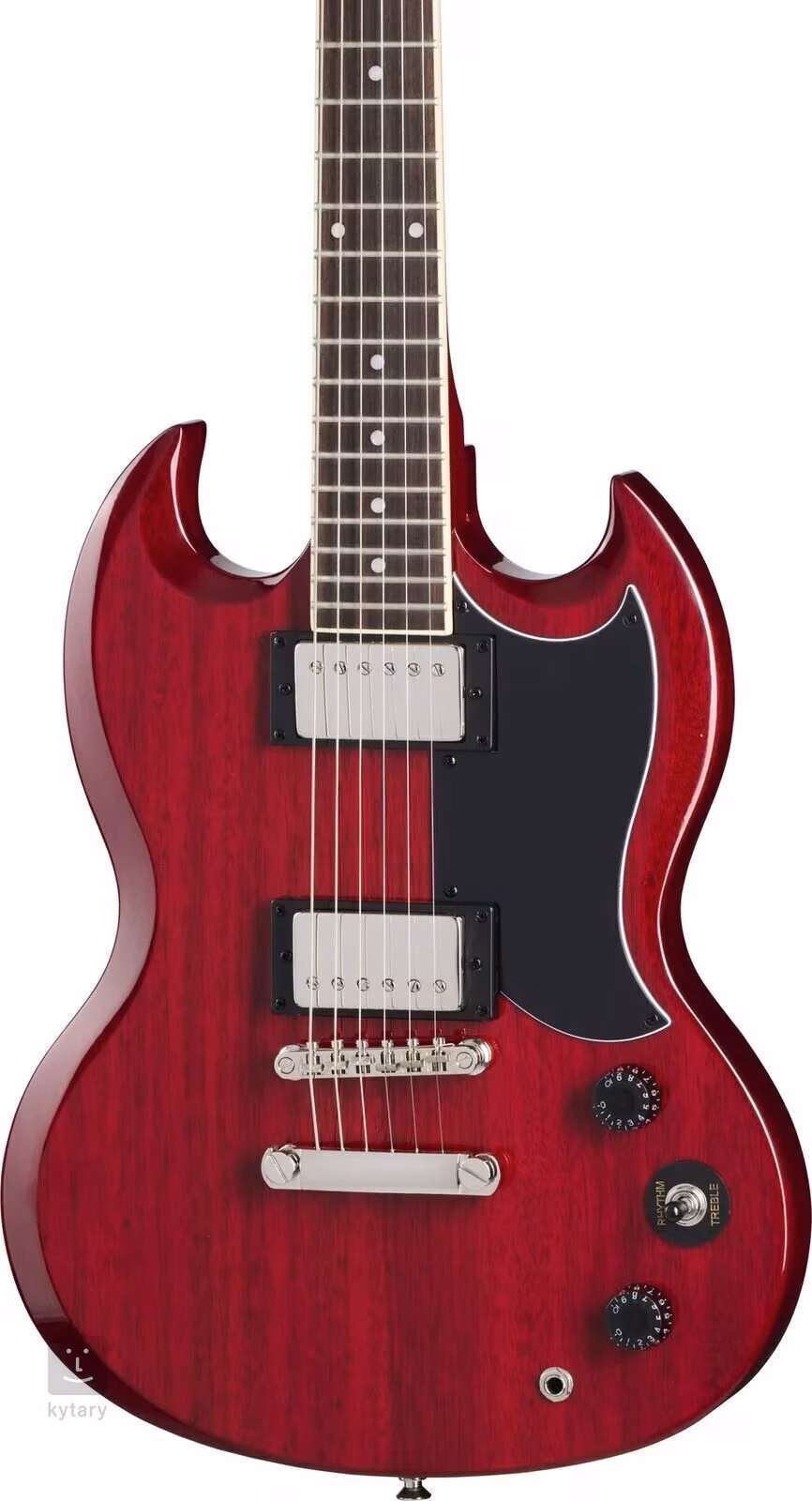 Telo elektrickej gitary SG Tribute Cherry je vyrobené z mahagónu. Mahagónový krk s príjemne zaobleným "C" profilom je prilepený k figovému hmatníku s dvadsiatimi dvoma Medium Jumbo pražcami. Polohové bodky na hmatníku uľahčujú orientáciu.