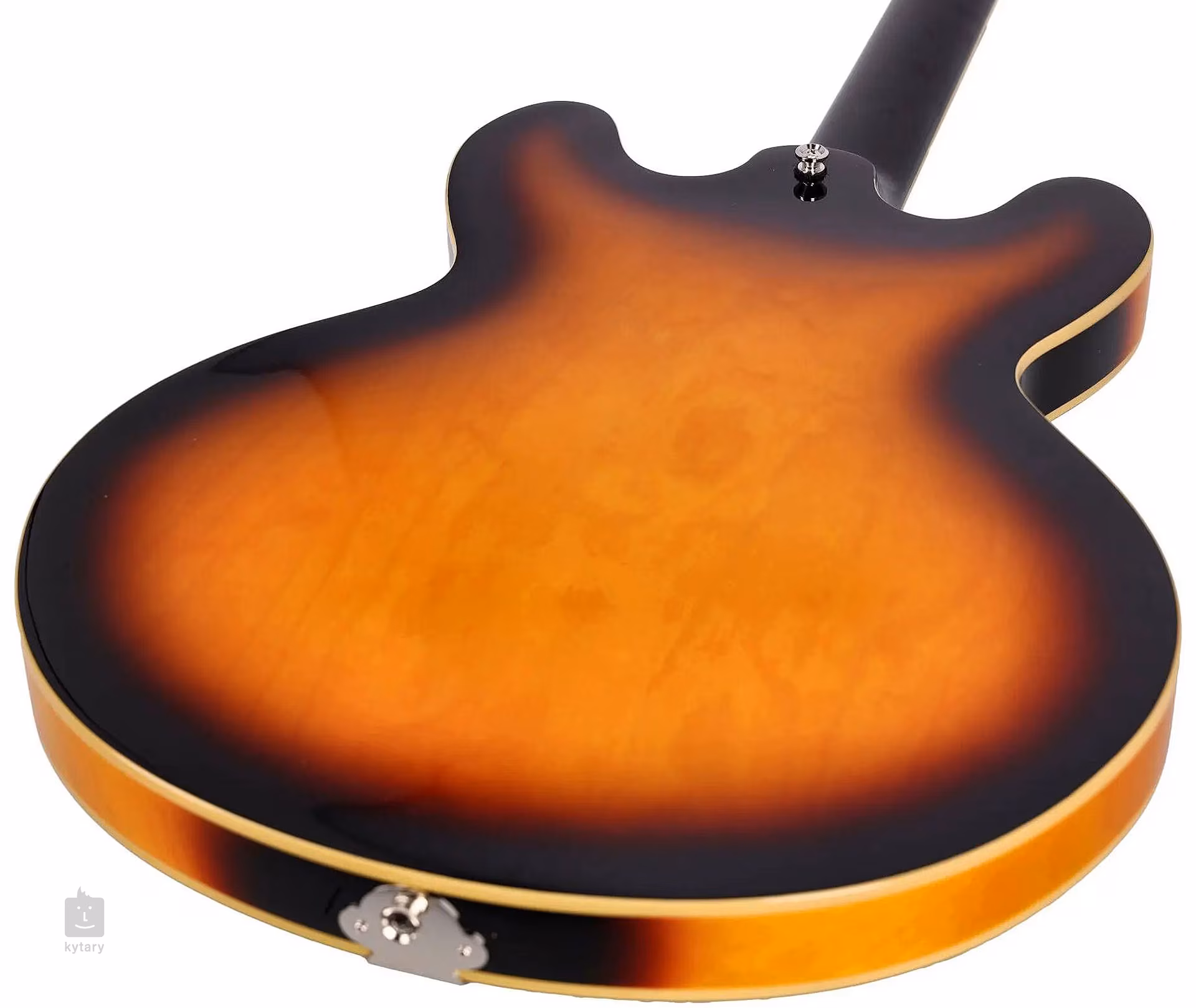 Struny sú uchytené v ladiacich mechanikách Epiphone Vintage Deluxe a cez mostík ABR-1 v kobylke Thinline Trapeze. Pekné spracovanie podčiarkuje lesklý nitrocelulózový lak, viazanie po obvode tela, pickguard Epiphone Casino a niklový hardware.