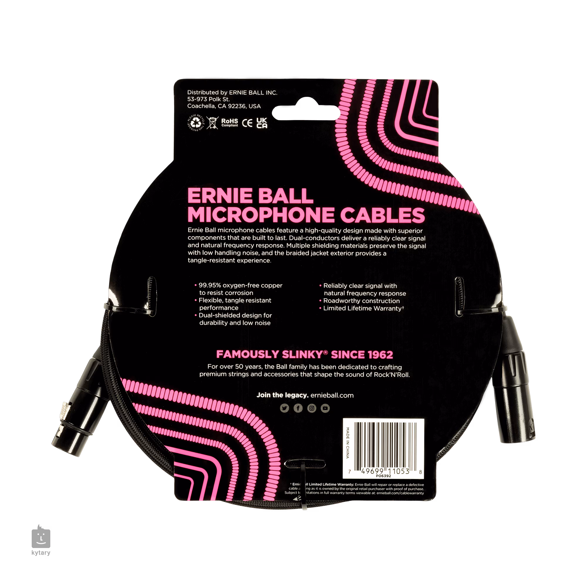 Mikrofónové káble Ernie Ball sa vyznačujú vysokokvalitnou konštrukciou vyrobenou z vynikajúcich komponentov, ktoré sú konštruované tak, aby vydržali aj tie najnáročnejšie situácie. Dvojité vodiče poskytujú spoľahlivo čistý signál a prirodzenú frekvenčnú odozvu. Viaceré tieniace materiály zachovávajú signál s nízkym šumom pri akejkoľvek manipulácii. Odolný opletený mikrofónový kábel na PVC zaručuje dlhotrvajúci výkon.
