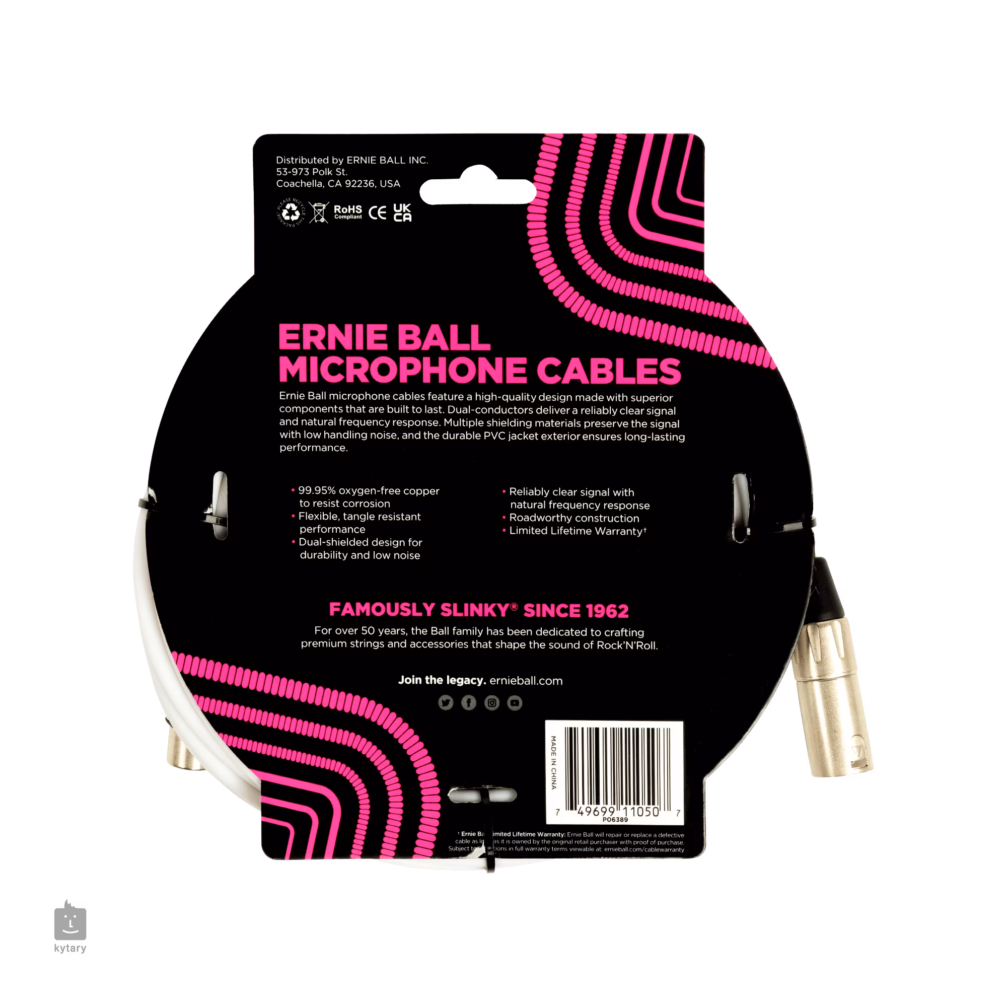 Profesionálne mikrofónové káble Ernie Ball USA majú vysokokvalitnú konštrukciu, ktorá je vyrobená z prvotriednych komponentov zaručujúcich dlhú životnosť. Dvojité vodiče poskytujú spoľahlivo čistý tón. Viaceré tieniace materiály zachovávajú signál s nízkym manipulačným šumom a odolný vonkajší plášť z PVC zaručuje dlhodobý výkon.