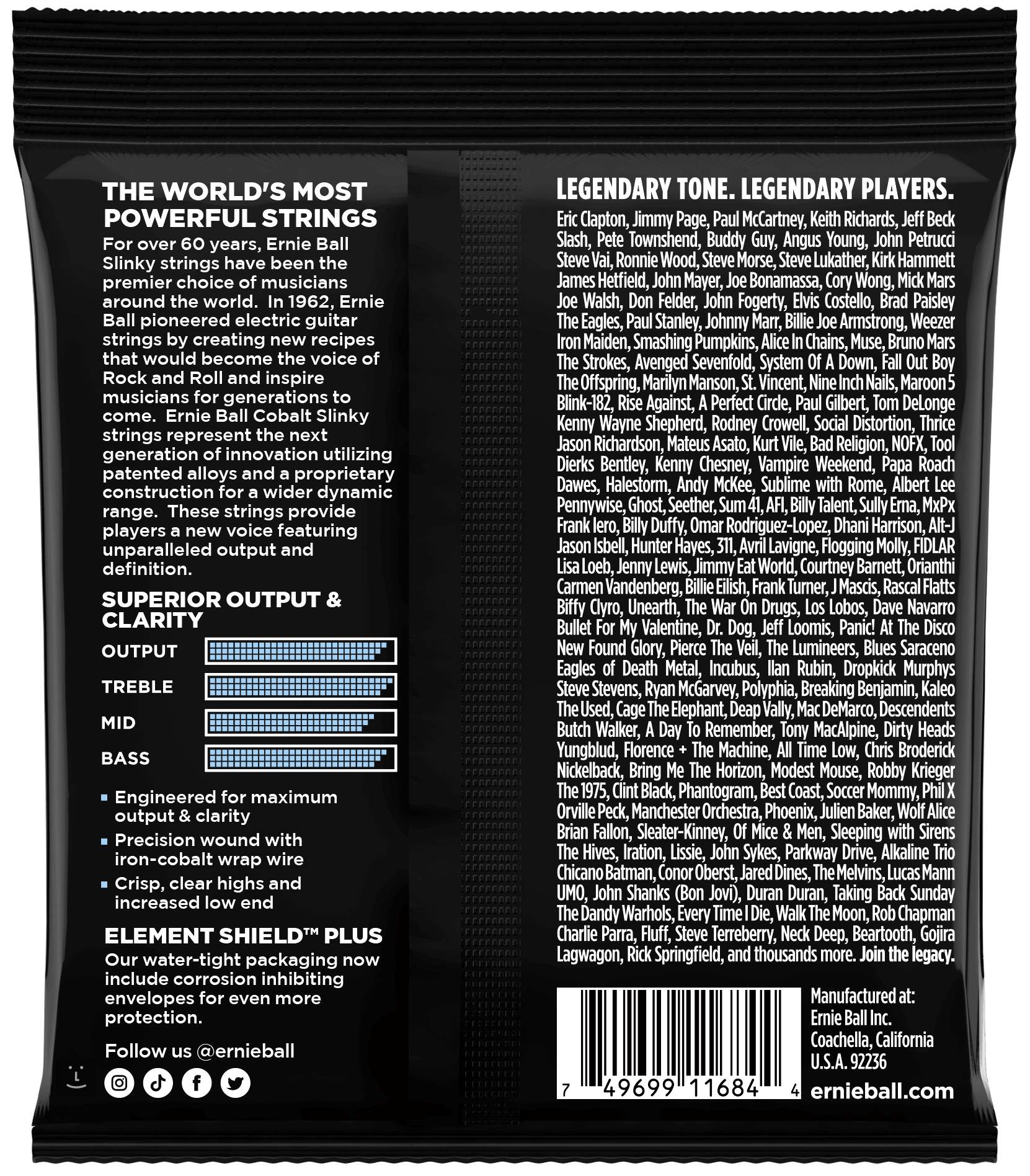 Struny Ernie BallCobalt Slinky pre elektrickú gitaru boli vyvinuté s cieľom maximalizovať hlasitosť a čistotu zvuku, pričom sa pri ich výrobe použili najnovšie materiály a výrobné technológie. Vyznačujú sa širokým dynamickým rozsahom, veľkým počtom vyšších harmonických, silnejšími basmi a čistými, prenikavými výškami. Ich čaro spočíva v použití kobaltu, ktorý lepšie spolupracuje s magnetickým poľom snímačov a ponúka presné snímanie zvuku. Kobalt tiež robí struny mäkšie a pružnejšie, čo oceníte najmä pri ohýbaní.