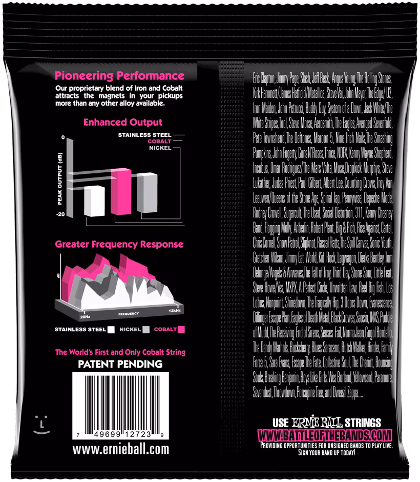 Struny Ernie BallCobalt Slinky pre elektrickú gitaru boli vyvinuté s cieľom maximalizovať hlasitosť a čistotu zvuku, pričom sa pri ich výrobe používajú najnovšie materiály a výrobné technológie. Vyznačujú sa širokým dynamickým rozsahom, veľkým počtom vyšších harmonických, silnejšími basmi a čistými, prenikavými výškami. Ich čaro spočíva v použití kobaltu, ktorý lepšie spolupracuje s magnetickým poľom snímačov a ponúka presné snímanie zvuku. Kobalt tiež robí struny mäkšie a pružnejšie, čo oceníte najmä pri ohýbaní.