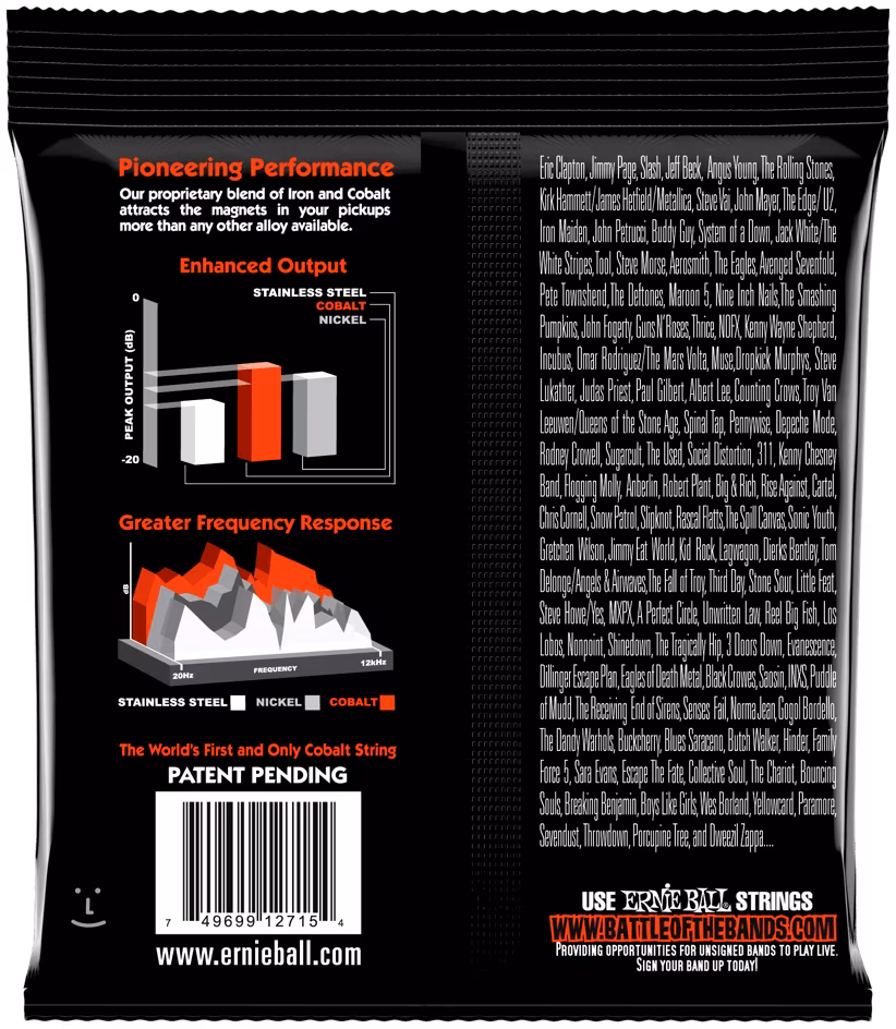 Struny Ernie BallCobalt Slinky pre elektrickú gitaru boli vyvinuté s cieľom maximalizovať hlasitosť a čistotu zvuku, pričom sa použili najmodernejšie materiály a výrobné technológie. Vyznačujú sa širokým dynamickým rozsahom, veľkým počtom vyšších harmonických, silnejšími basmi a čistými, prenikavými výškami. Ich kúzlo spočíva v použití kobaltu, ktorý lepšie spolupracuje s magnetickým poľom snímačov a ponúka presné snímanie zvuku. Kobalt tiež robí struny mäkšie a pružnejšie, čo oceníte najmä pri ohýbaní.