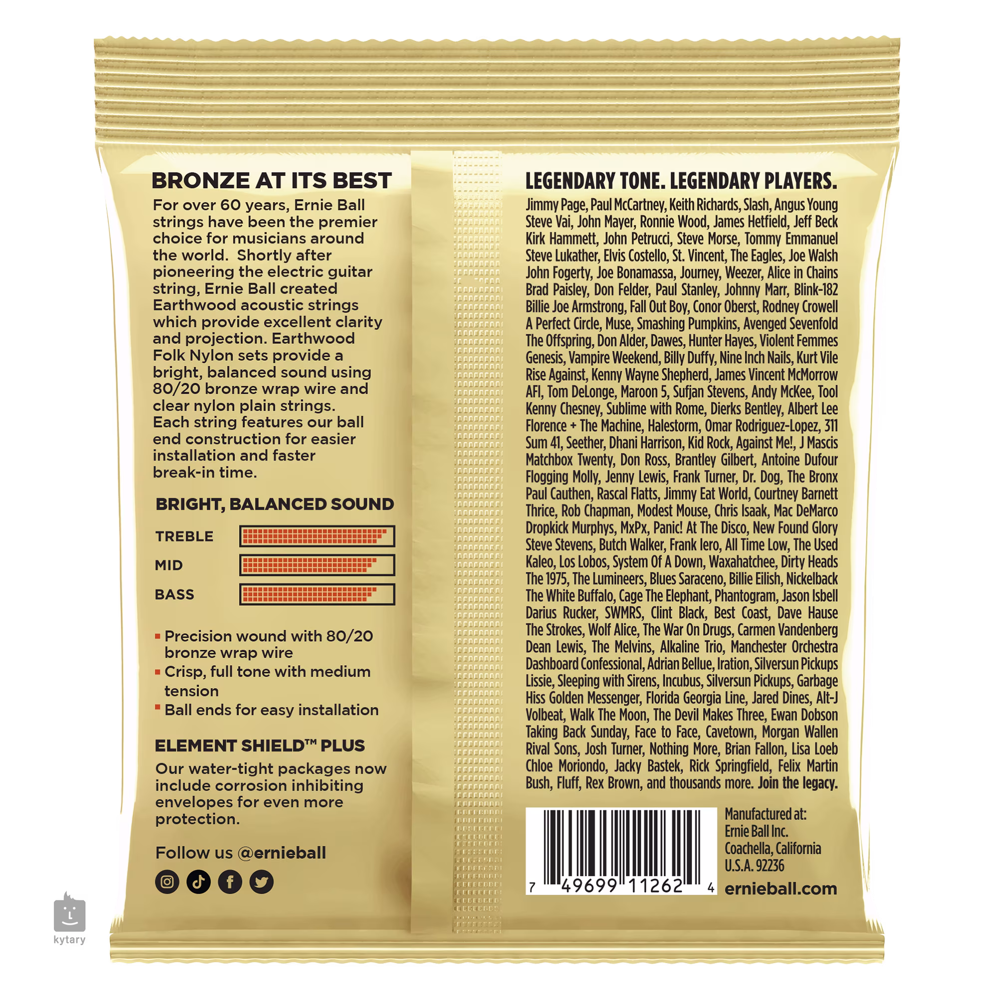Tieto nylonové struny Ernie Ball zo série Earthwood sú určené pre všetkých folkových hráčov, ktorí hľadajú pre svoju klasickú gitaru úderný a silný zvuk, podobný kovovým strunám akustických gitár. Sú vyrobené z číreho nylonu a basové struny sú ovinuté bronzom 80/20. Mnohých hráčov poteší guľôčkové zakončenie, ktoré uľahčuje výmenu strún.