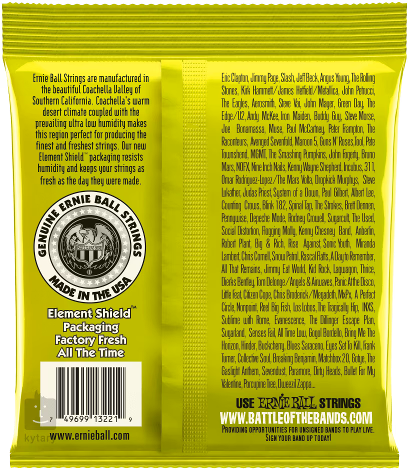 Tieto struny Ernie Ball sú absolútnym bestsellerom a zlatým štandardom medzi strunami pre elektrickú gitaru. Vynikajú najmä kvalitou použitých materiálov, precíznou výrobou a zvukovou univerzálnosťou, vďaka čomu sú vhodné pre takmer akýkoľvek hudobný žáner. Sú založené na šesťhrannom oceľovom jadre a valcovom niklovanom oceľovom vinutí. Výsledkom je frekvenčne vyvážený tón, ktorý sa dá použiť v rockovej, metalovej, popovej a bluesovej hudbe.
