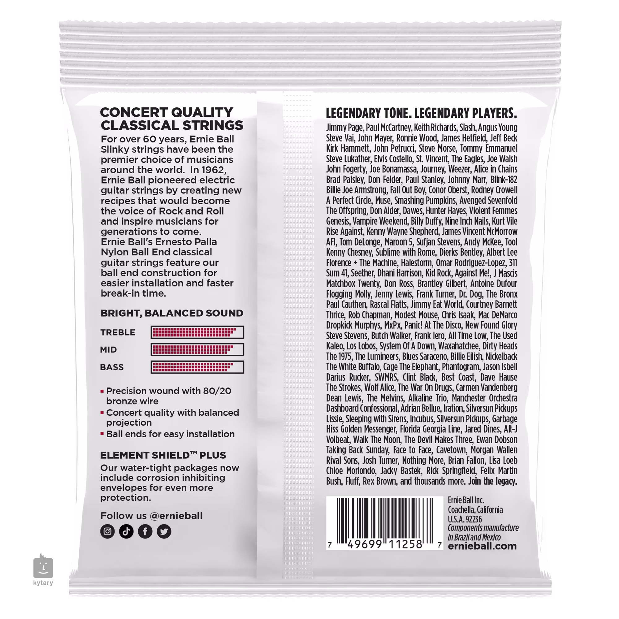 Tieto nylonové struny Ernie Ball zo série Ernesto Palla sú vyrobené z najjemnejšieho čierneho nylonu, ktorý je pri basových strunách obalený bronzom 80/20. Výsledkom je silný, prenikavý zvuk podobný kovovým strunám akustickej gitary. Mnohých hráčov poteší guľôčková koncovka, ktorá uľahčuje výmenu strún.
