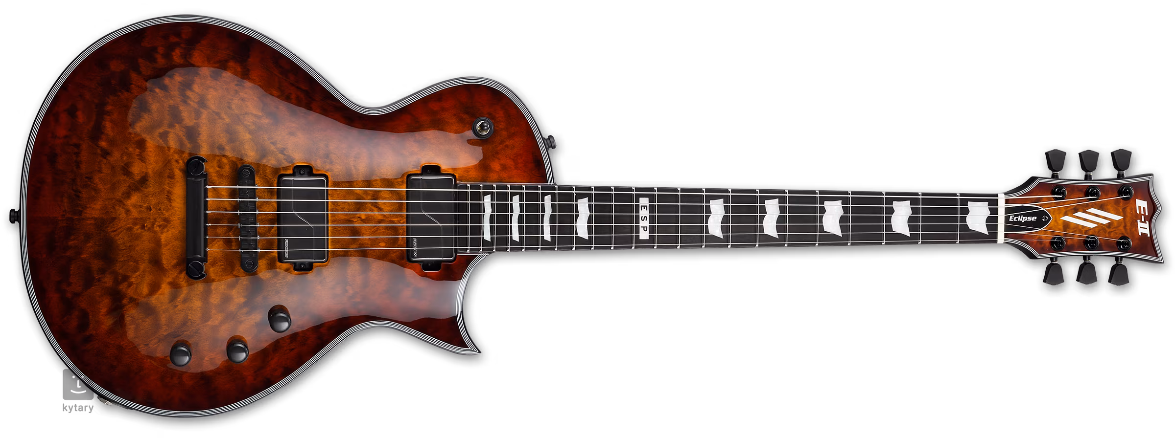 ESP E-II ECLIPSE Tiger Eye Sunburst je elektrická gitara v tradičnom dizajne s jedným výrezom (LP). Mahagónové telo gitary zdobí efektná vrchná doska z plamenného javora podporená povrchovou úpravou Tiger Eye Sunburst a obvodovým lemovaním. K mahagónovému krku s konštrukciou set-thru, t. j. krku zapustenému hlbšie do tela, je prilepený ebenový hmatník osadený dvadsiatimi dvoma pražcami typu Extra Jumbo z nehrdzavejúcej ocele. Orientáciu na povrchu hmatníka uľahčujú polohové bloky a intarzia ESP na dvanástom pražci.