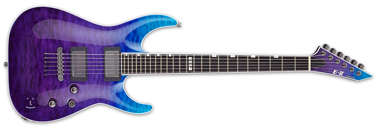 Táto elektrická gitara E-II Horizon NT-II na prvý pohľad zaujme vrchnou doskou z plamenného javora s povrchovou úpravou Blue Purple Gradation a kontrastným svetlým lemovaním. Samotné telo gitary je vyrobené z mahagónu. Trojdielny javorový krk s užším U profilom spája ebenový hmatník osadený dvadsiatimi štyrmi pražcami typu Extra Jumbo. Orientáciu na jeho povrchu uľahčujú perleťové polohovacie bloky.
