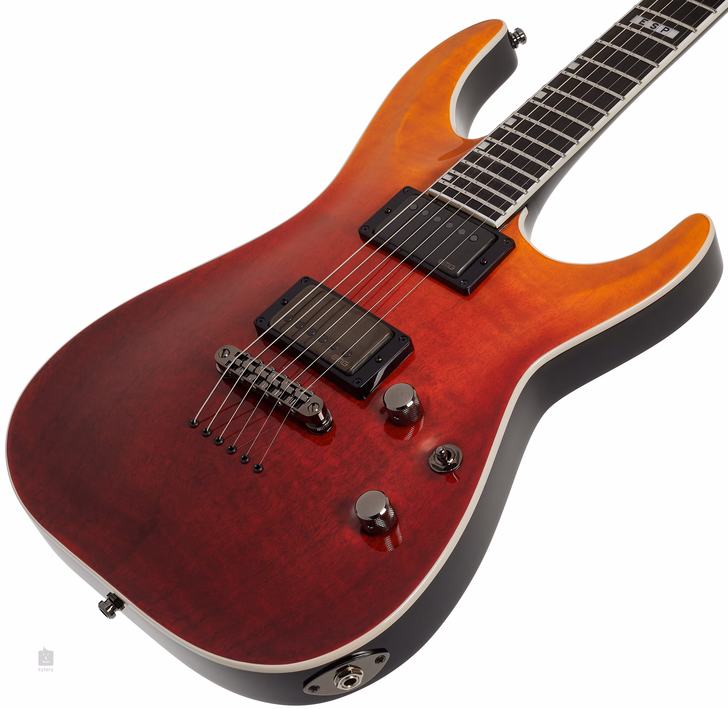 Elektrická gitara E-II Horizon NT-II na prvý pohľad zaujme pôsobivou povrchovou úpravou Tiger Eye Amber Fade, ktorá kontrastuje s bielym telom a lemovaním na hlave. Samotné telo nástroja je vyrobené z mahagónu a pôsobivá vrchná doska z plamienkového javora. K trojdielnemu javorovému krku s konštrukciou set-thru, teda krkom zapusteným hlboko do tela, a užším profilom Fast Thin U je prilepený ebenový hmatník osadený dvadsiatimi štyrmi pražcami typu Extra Jumbo. Orientáciu po jeho povrchu uľahčujú posunuté značky polohy.