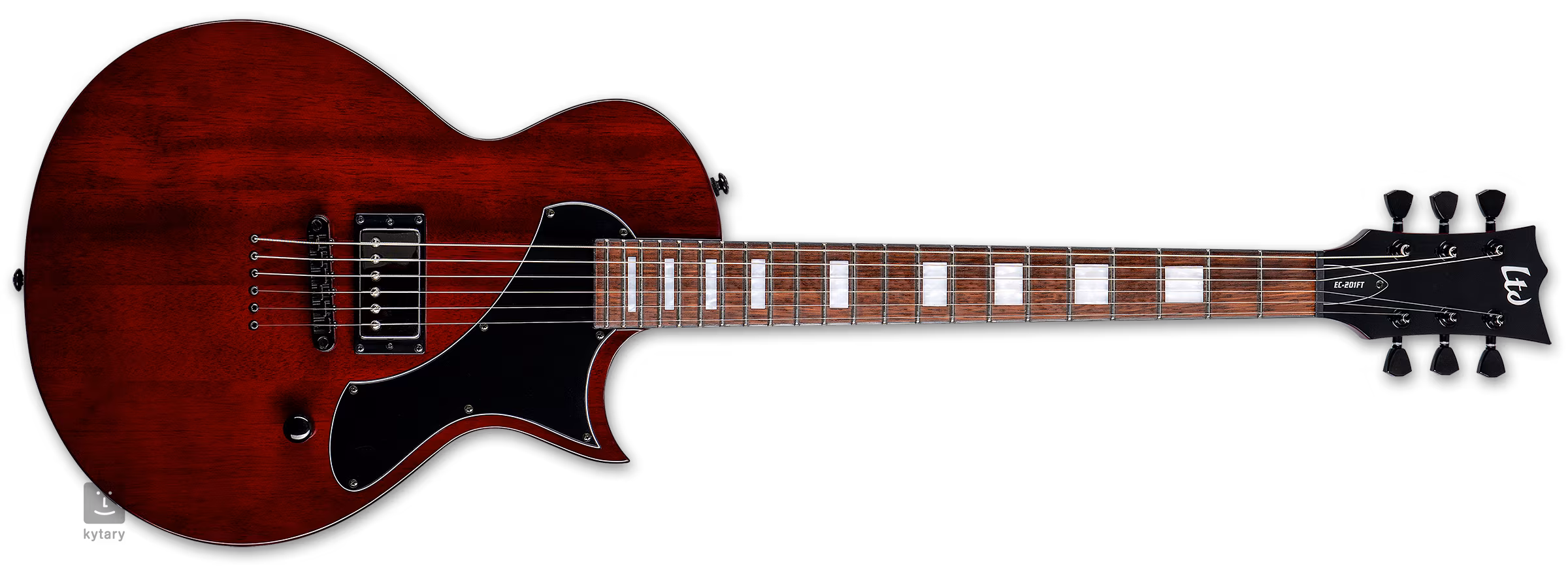 Ploché mahagónové telo modelu EC-201 FT SEE THRU BLACK CHERRY spája trojdielny mahagónový krk. Dvadsaťdva Extra Jumbo pražcov rozdeľuje pražený jatobový hmatník. Polohové bloky z imitácie perlete uľahčujú orientáciu na hmatníku.